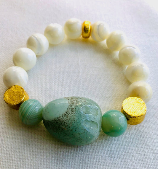 Blue Amazonite and Alabaster Gemstone Gold Bracelet Stack Set