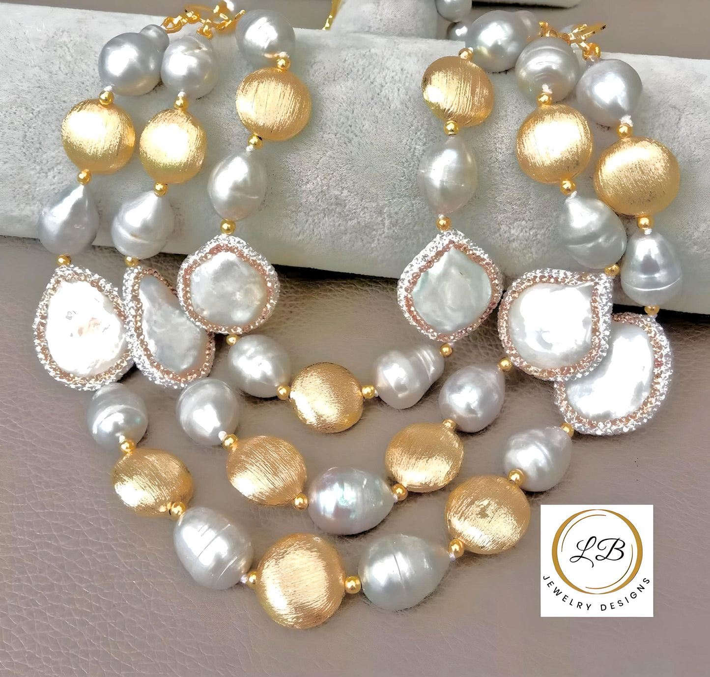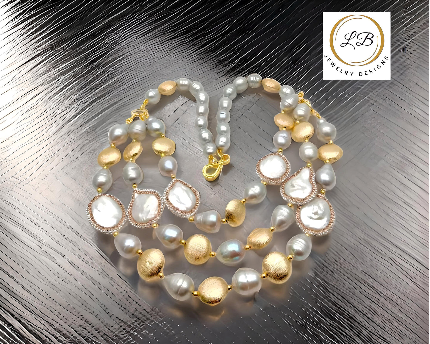 Discover the elegance of this adjustable Statement Necklace, incorporating three strands of 18k brushed gold vermeil beads and authentic pearls. With each strand meticulously constructed with baroque pearls, coin pearls adorned with Marcasite stones, and 18k brushed gold vermeil beads, this necklace exudes sophistication. The length can be easily adjusted from 20" to 23", and its versatile design allows for three unique ways to wear it.