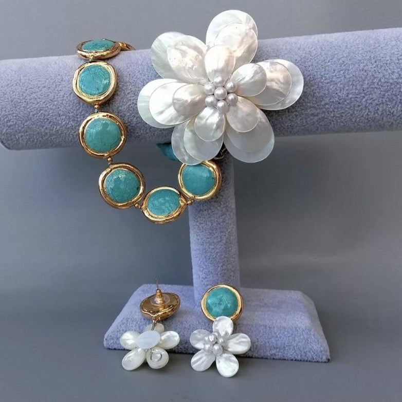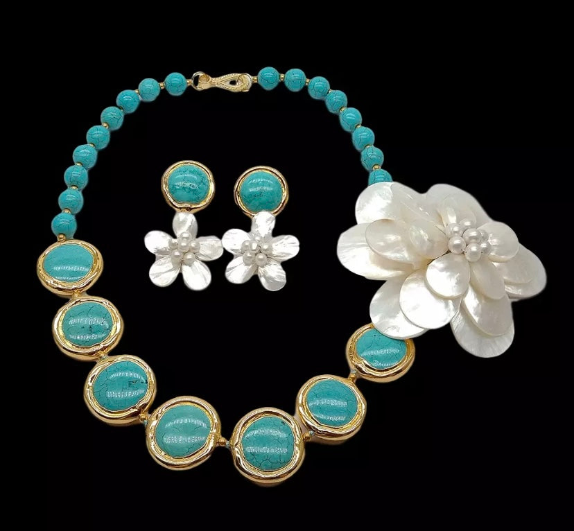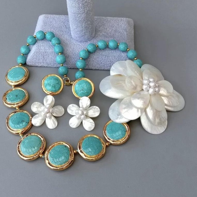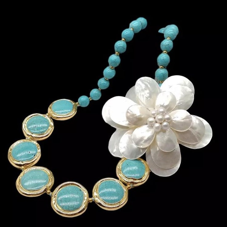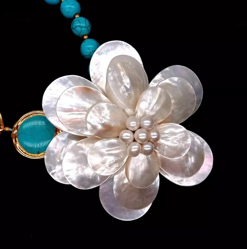 Coastal Turquoise & Pearl Pendant Statement Necklace 20”