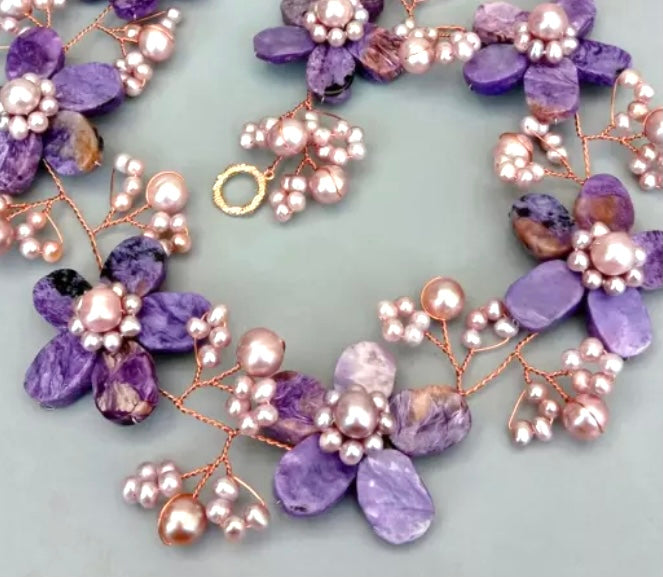 Be enchanted by the stunning allure of this unique 21” gemstone statement necklace. Meticulously crafted with mesmerizing purple Charoite gemstones and delicate pink freshwater pearls, it boasts a graceful and feminine design that will captivate all who see it. The captivating purple tones are enhanced by 4-5mm to 10mm pearls and 46mm flower pendants, showcasing Charoite's extraordinary qualities of translucent lavender to purple color, pearly sheen, and intricate patterns.