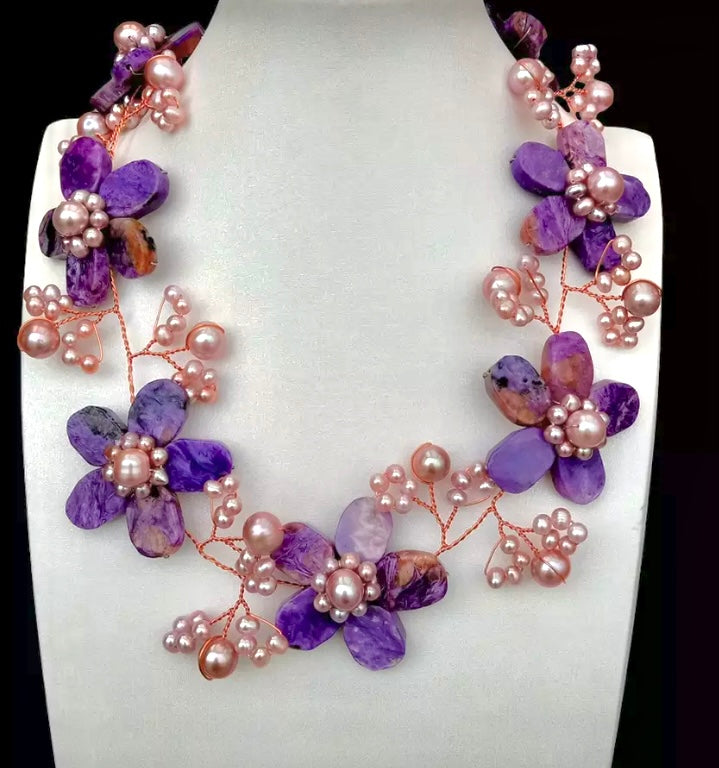 Captivating Purple Charoite & Pearl Gemstone Statement Necklace