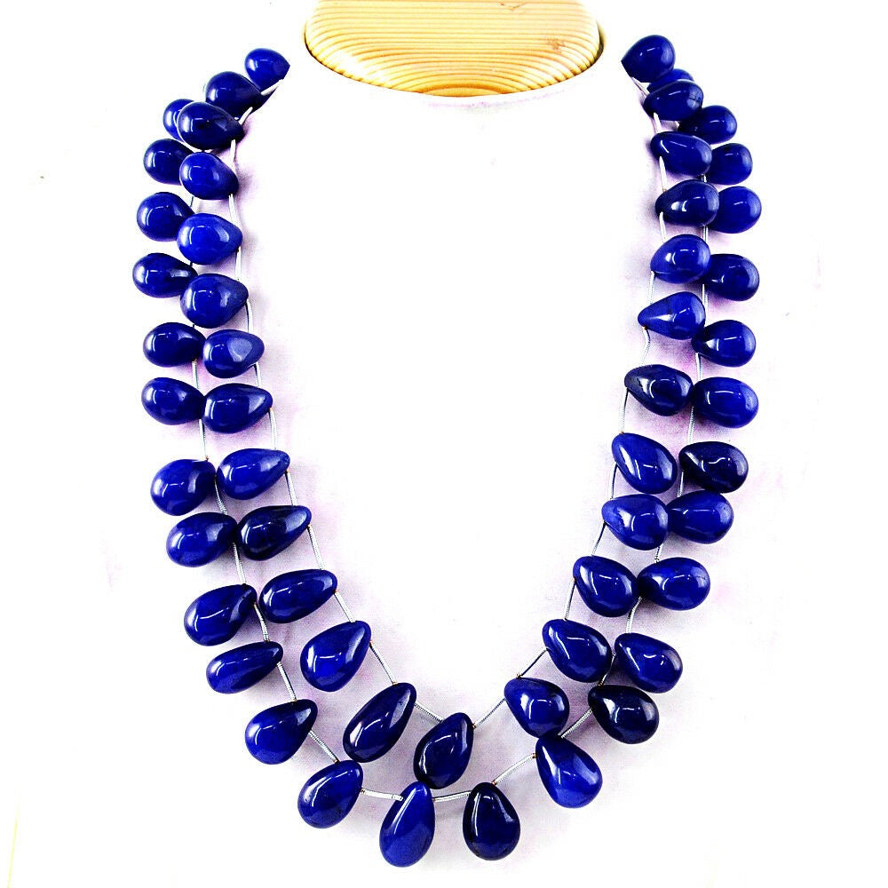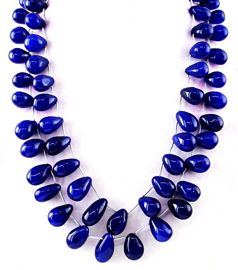 This stunning double-strand statement necklace features expertly crafted blue sapphires in a traditional pear shape design. The braided string-tie at the back allows for adjustable length, making it perfect for wearing at 18-20". These 100% natural earth-mined sapphires are buffed with oil to achieve their opaque tint. A great find for those looking for genuine gems on a budget, with a total carat weight of 890.00 and each individual gem at least 10k. While blue is the classic hue for sapphires, other colors such as yellow, purple, orange, pink, and green can also be found. Don't miss out on the unique "parti sapphires" with their captivating multi-hued appearance.