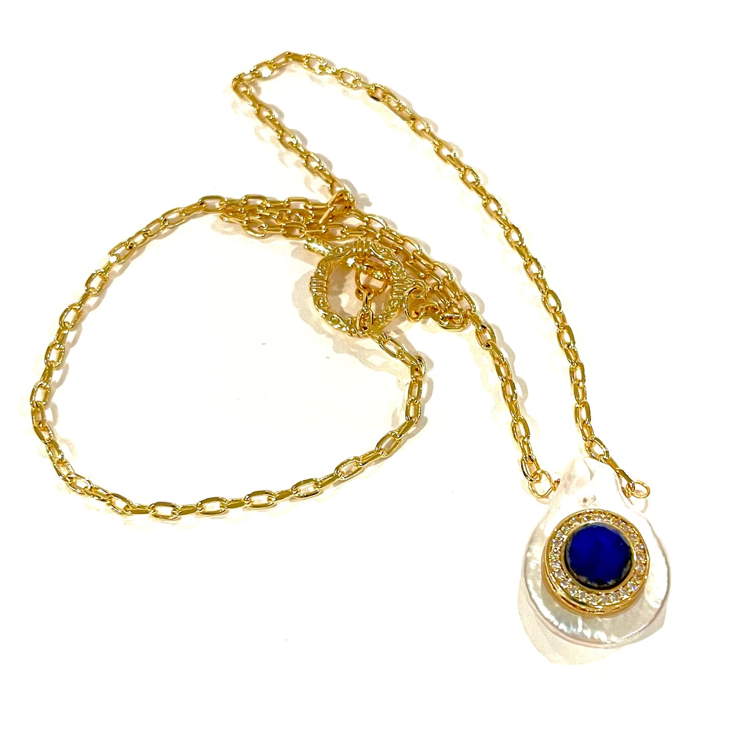 This 18” gold plate paper chain necklace was designed with a modern twist. It was made with a (21 x 28mm) natural, white coin-shaped Keshi cultured pearl pendant accented with a (13mm) Lapis Lazuli gemstone with pave accents.