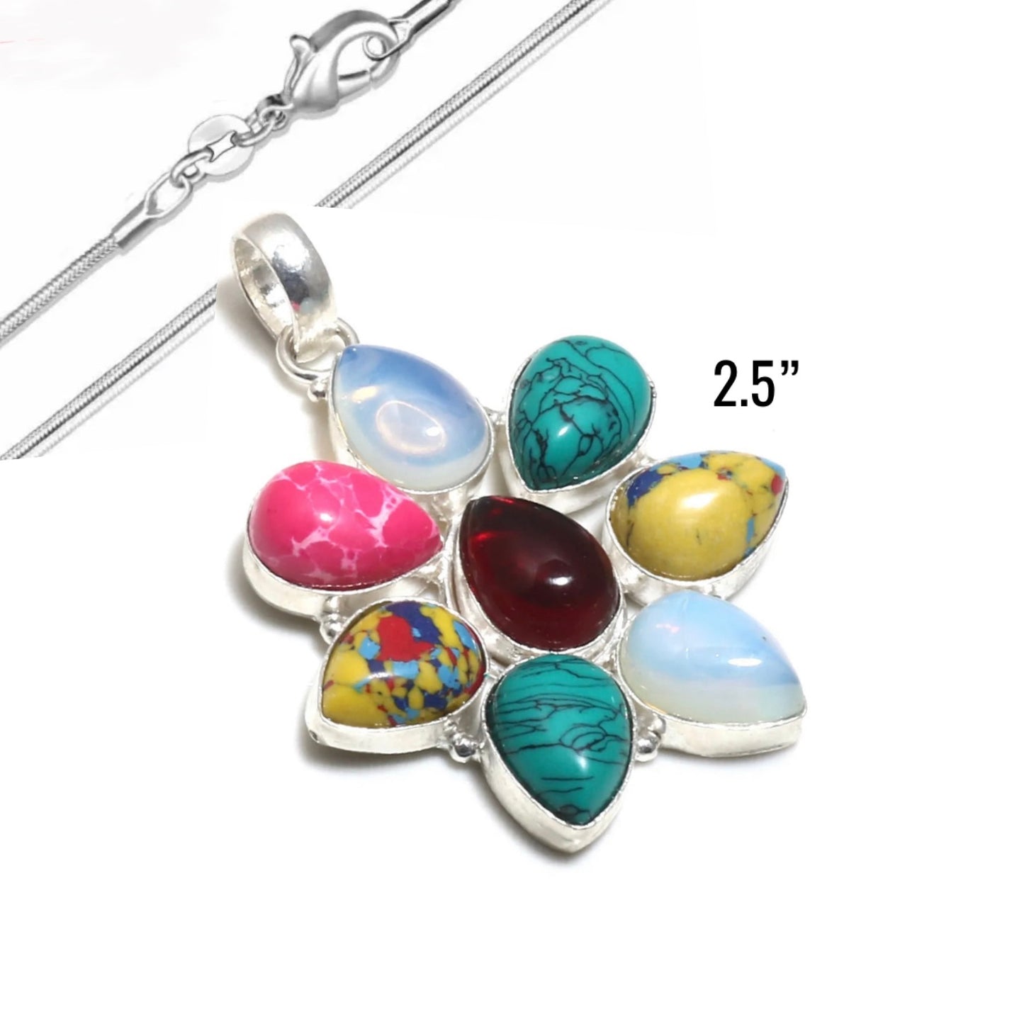 Sterling Silver Multi-Colored Turquoise, Jasper, Milky Opal, Garnet Gemstone Pendant Necklace 2.5