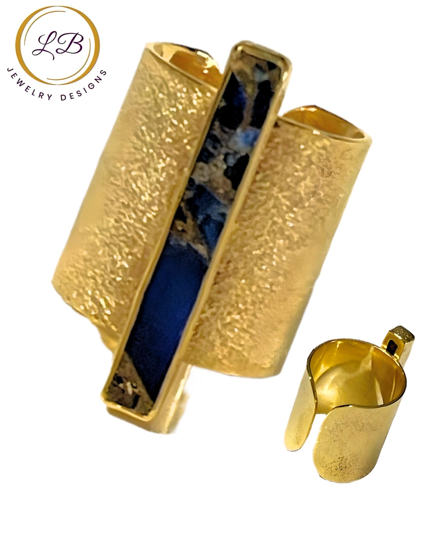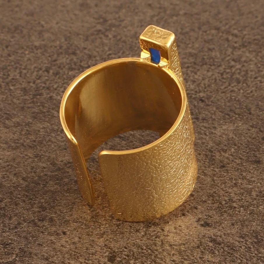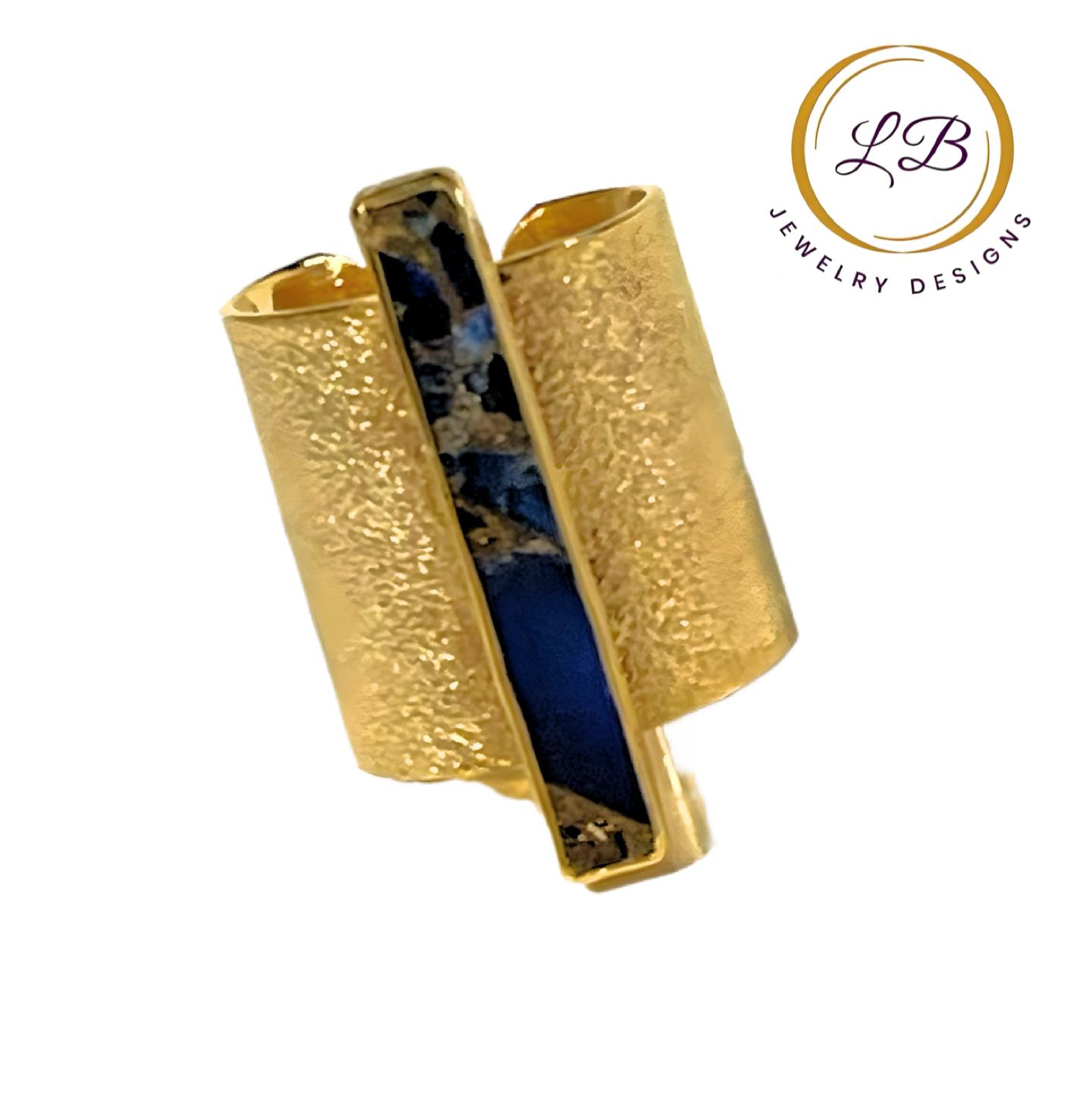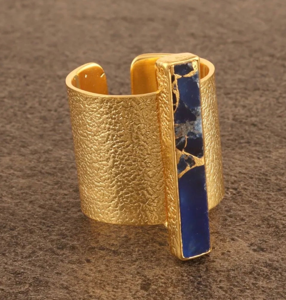 This cigar style ring boasts a unique design, expertly crafted with a textured starburst pattern and an elegant combination of a blue Lapis Lazuli gemstone set in a gold vermeil bar center. Made with 24k gold vermeil over copper, this ring guarantees quality and durability.
