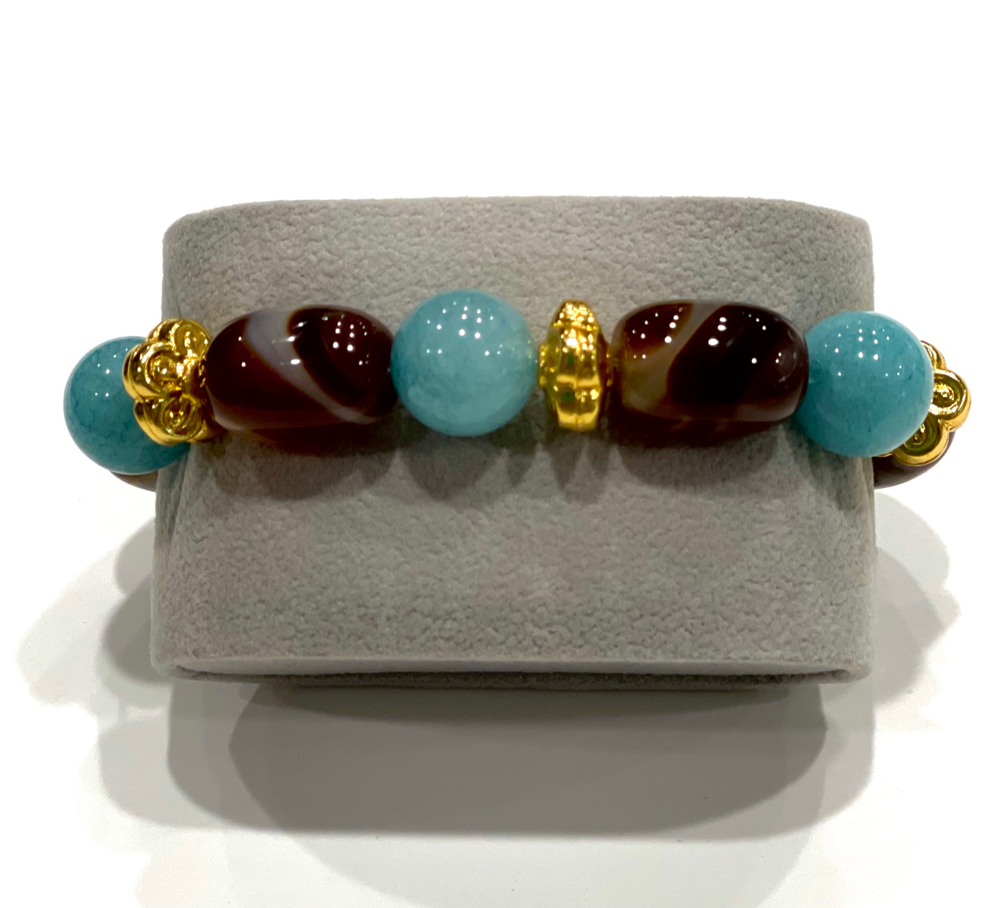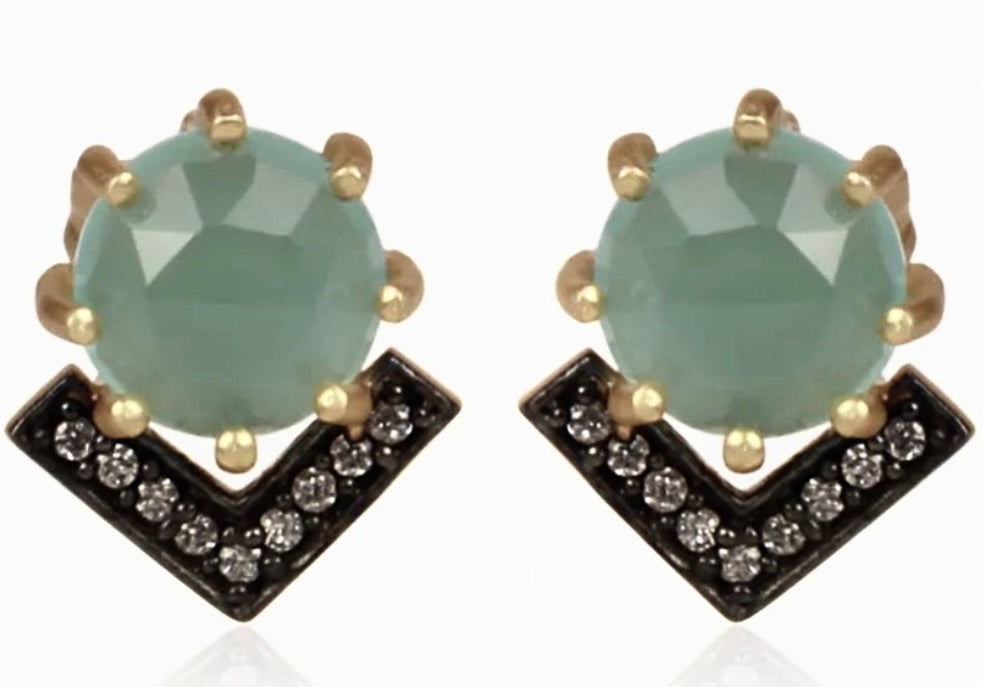 This exquisite set contains a Harbour Blue Chalcedony pendant with an 18k gold plated curb chain and S hook closure. The artisanal bracelet is composed of blue aquamarine and Botswana gemstones, 18k gold vermeil Bali spacer beads, and 8mm Aqua Chalcedony stud earrings featuring a "V" of black rhodium and white zirconia crystals. Harbour Blue Chalcedony is thought to bring about a serene ocean vibe, as well as a wise hue that penetrates the innermost realm of the heart.