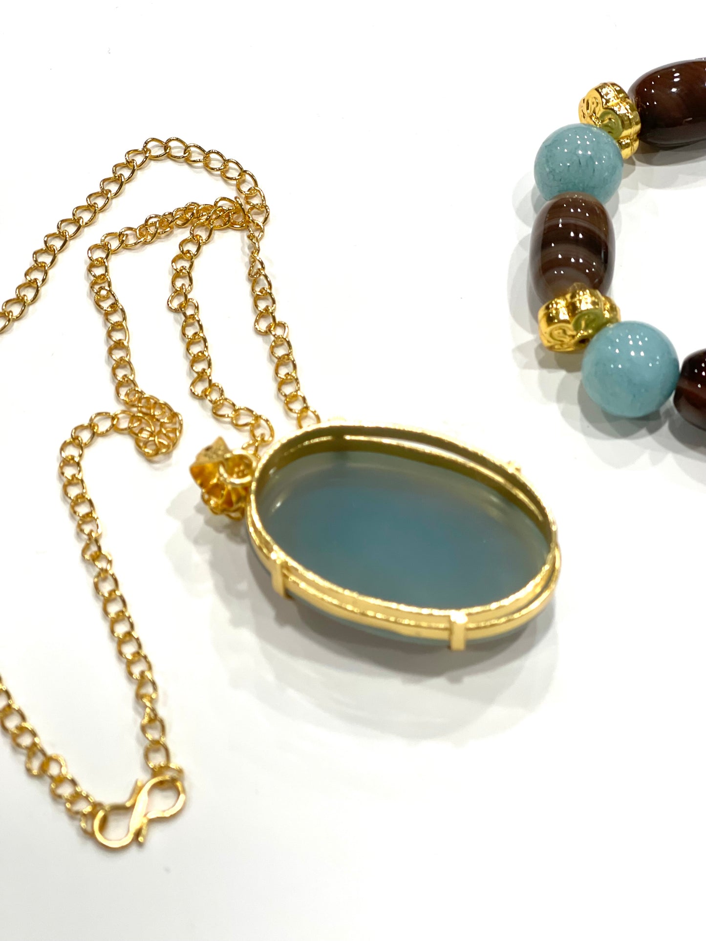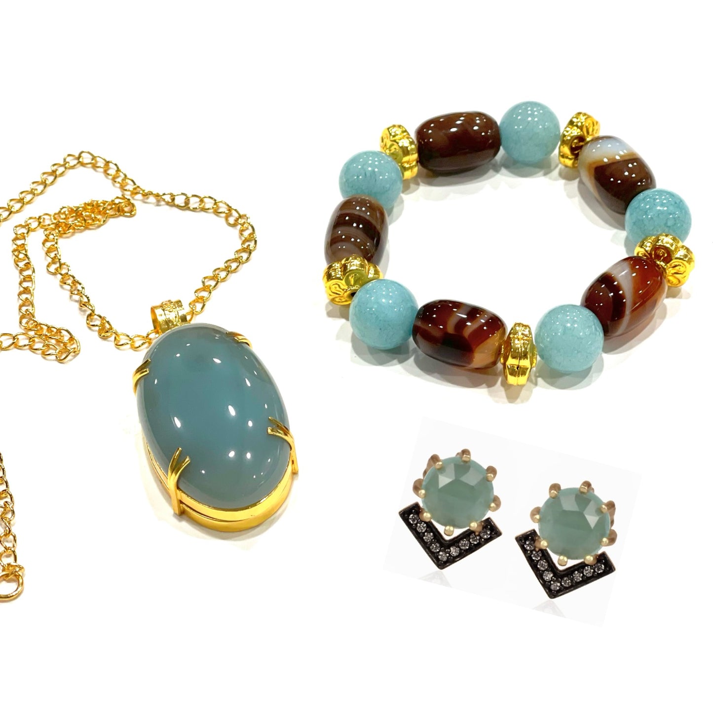 Harbor Blue Chalcedony Gold Chain Pendant Necklace, Gemstone Bracelet and Earrings Set