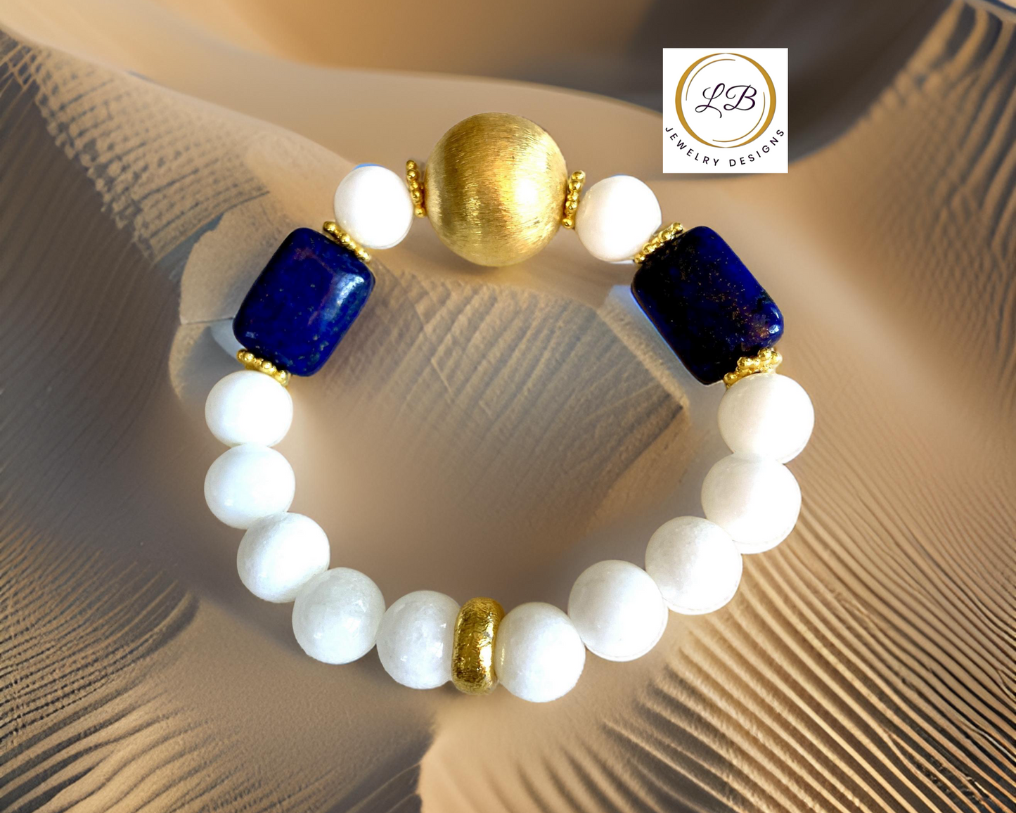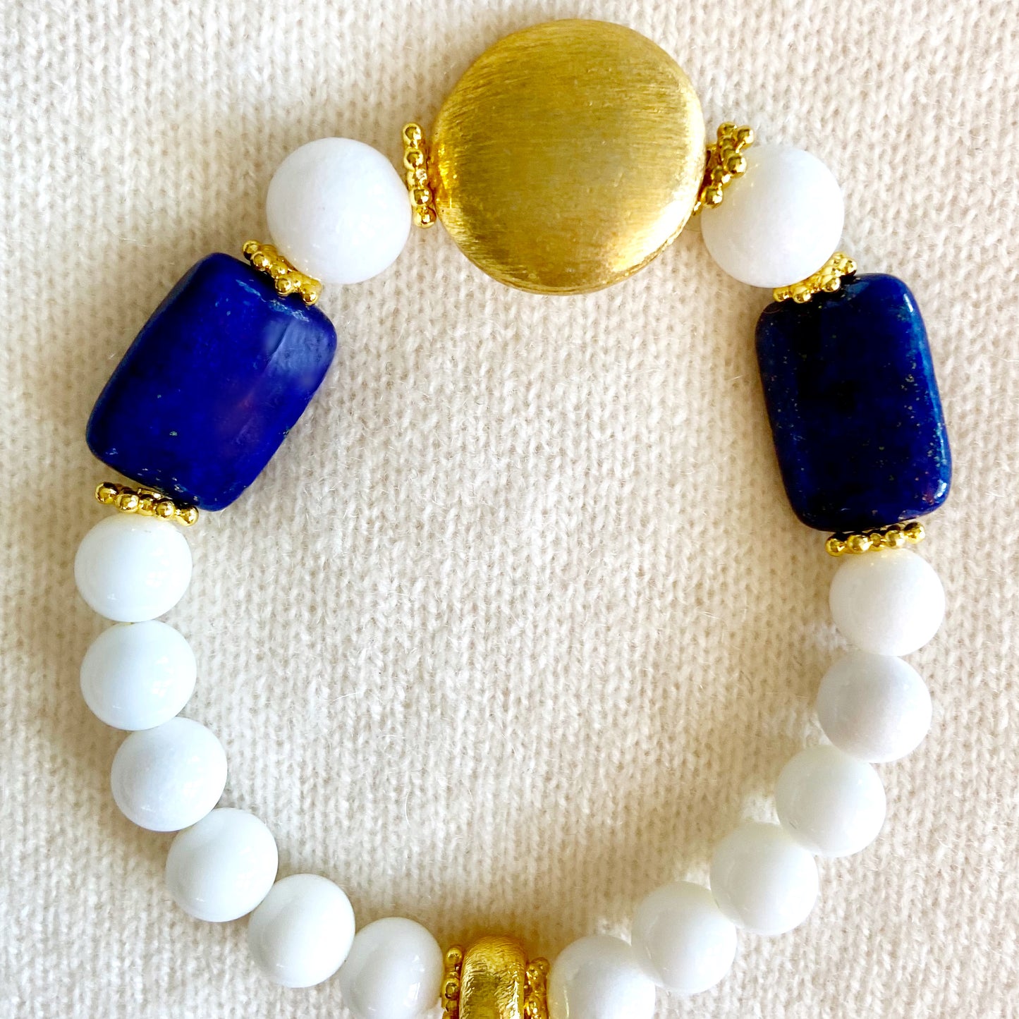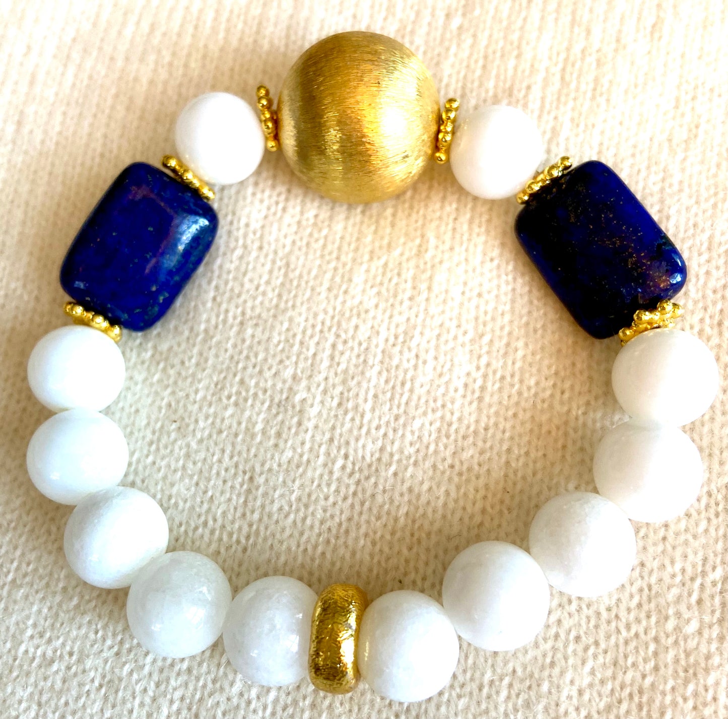 This exquisite bracelet showcases two rectangular Lapis Lazuli gemstones and white 10mm Alabaster gemstones, with a brushed gold vermeil centerpiece (18k). Select from two choices - a flat center bead or a 16mm round gold vermeil center bead. Ideal for all seasons, but particularly for spring and summer. 7”