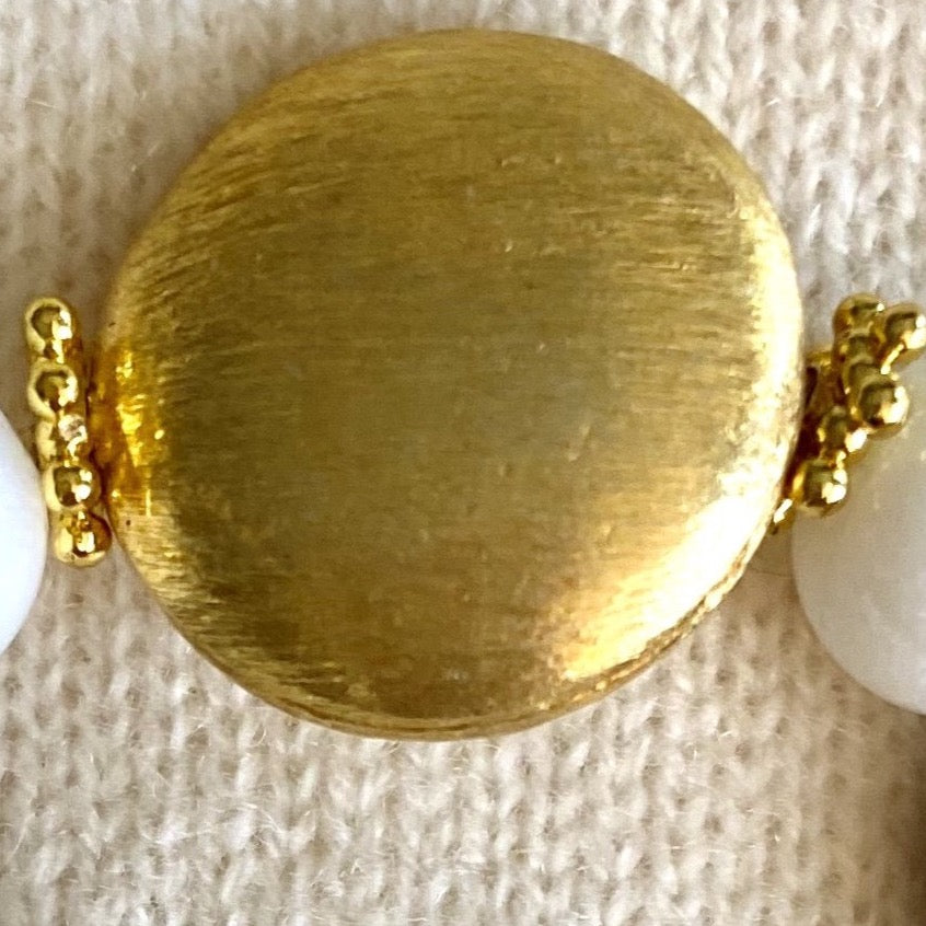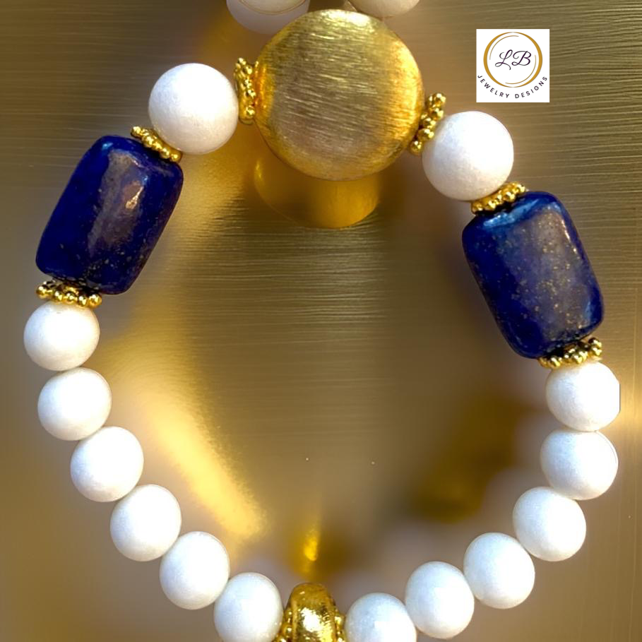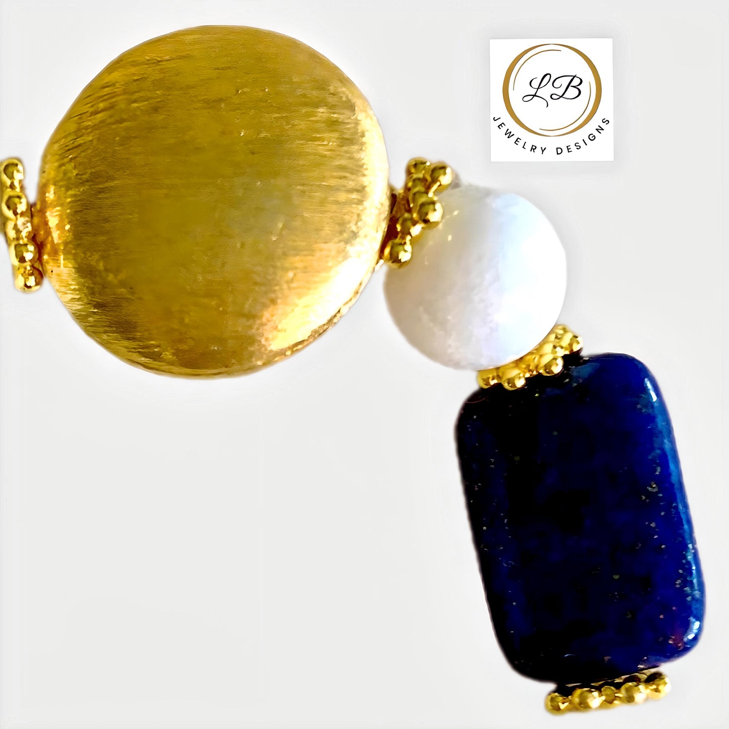 This exquisite bracelet showcases two rectangular Lapis Lazuli gemstones and white 10mm Alabaster gemstones, with a brushed gold vermeil centerpiece (18k). Select from two choices - a flat center bead or a 16mm round gold vermeil center bead. Ideal for all seasons, but particularly for spring and summer. 7”