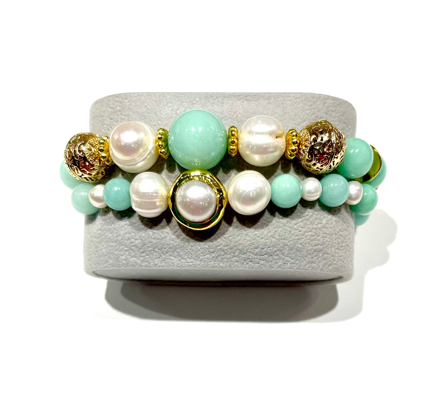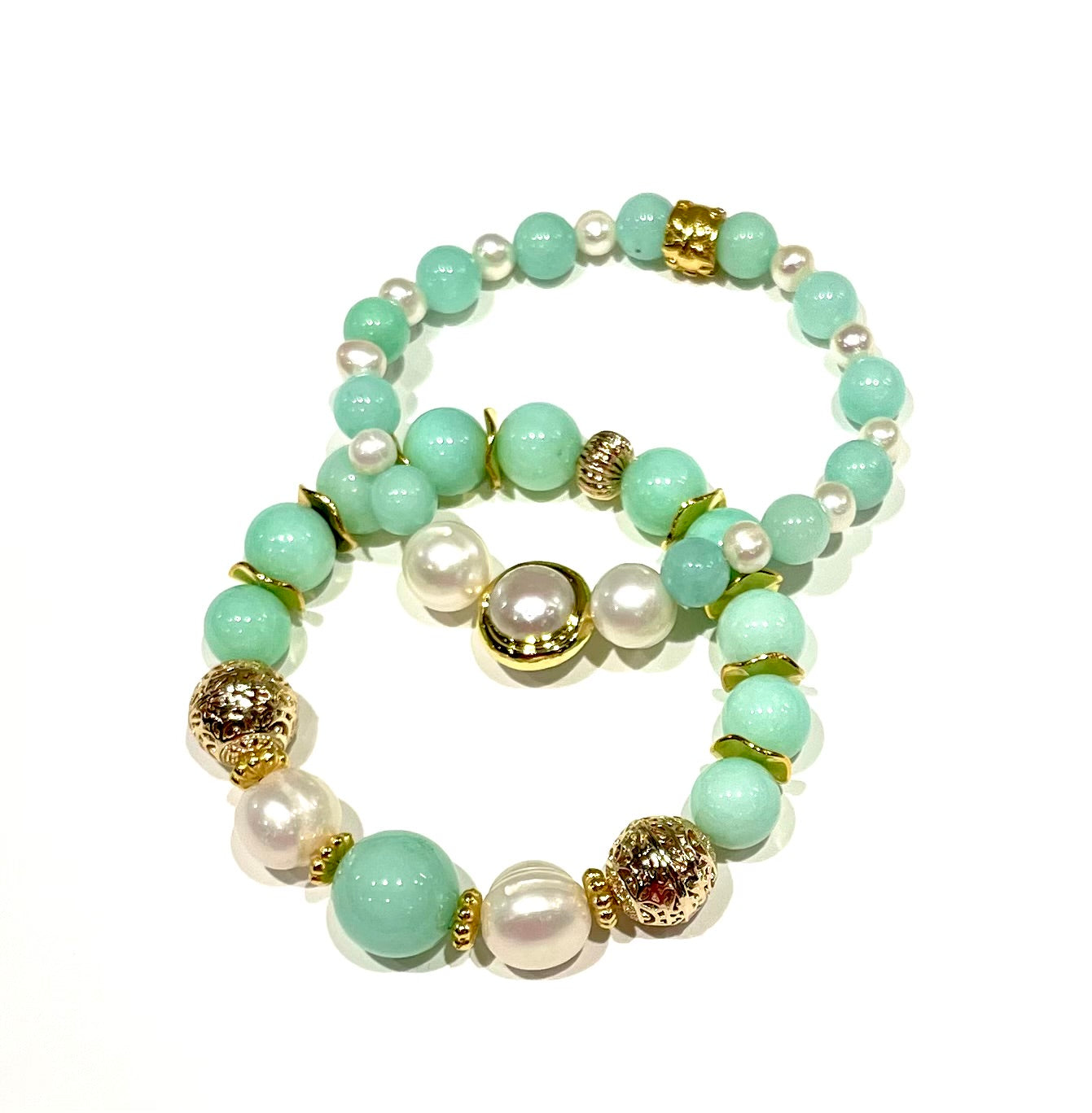Amazonite & Pearl Gemstone Gold Bracelet Set