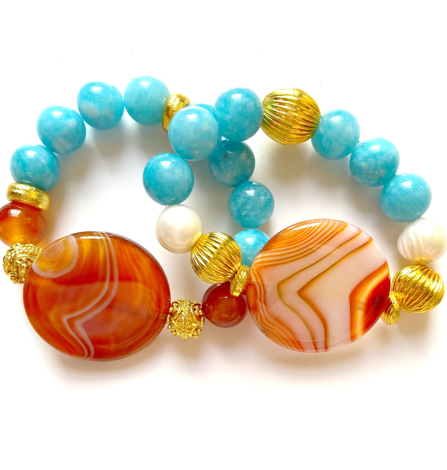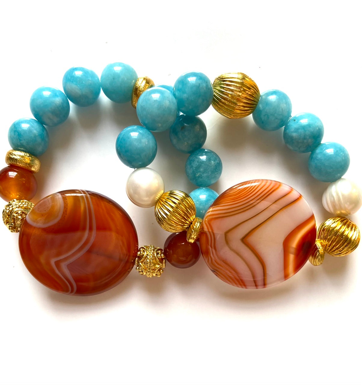These are two beautiful statement bracelet and can be worn alone to add a special touch to any outfit. The combination of the beautiful orange-striped onyx center bead with the blue aquamarine and white freshwater baroque pearls is a unique combination. The 18k gold-filled ribbed (corrugated) beads add a special touch. Two variations. Both are 6 & 3/4" and wears more like a watch.