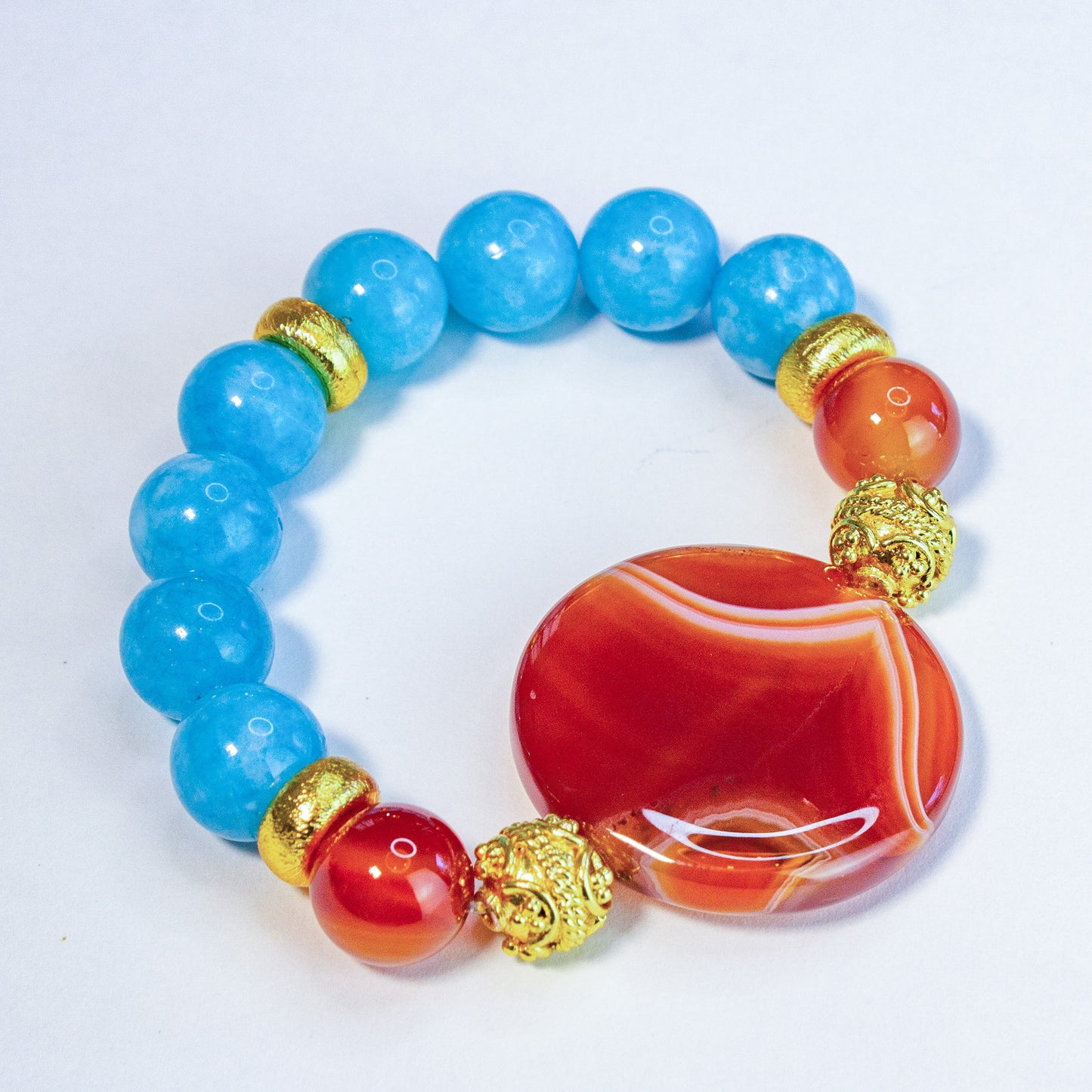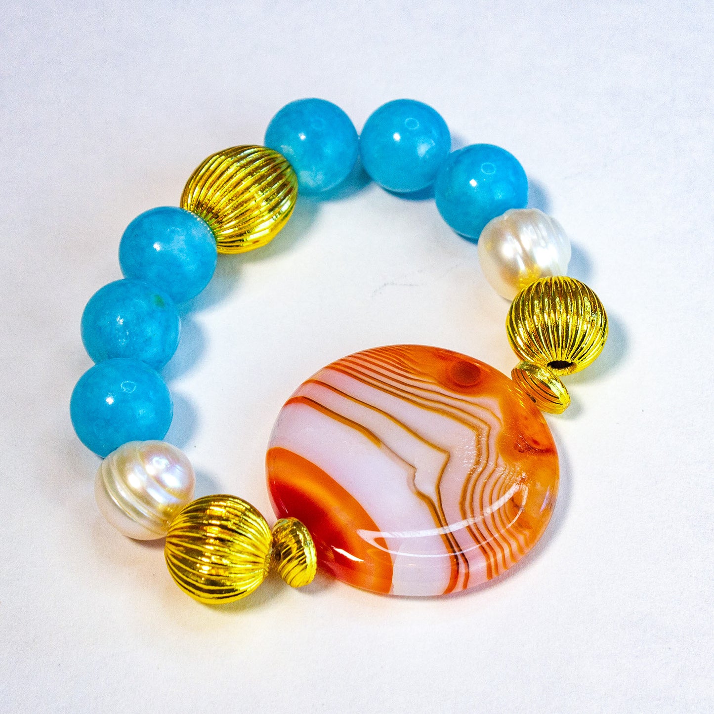 Orange-Striped Onyx, Aquamarine & Pearl Gemstone Beaded Bracelet (Two Designs)