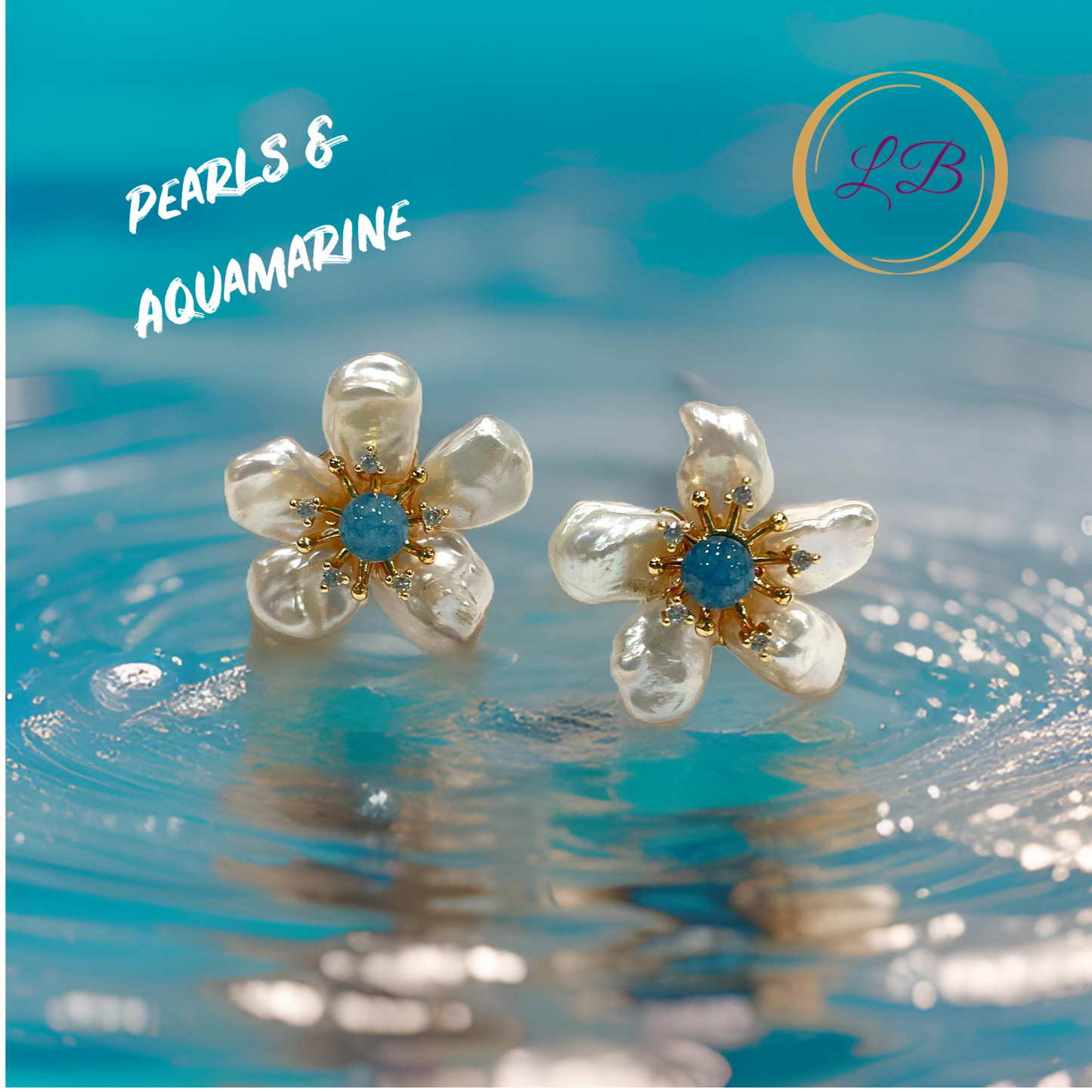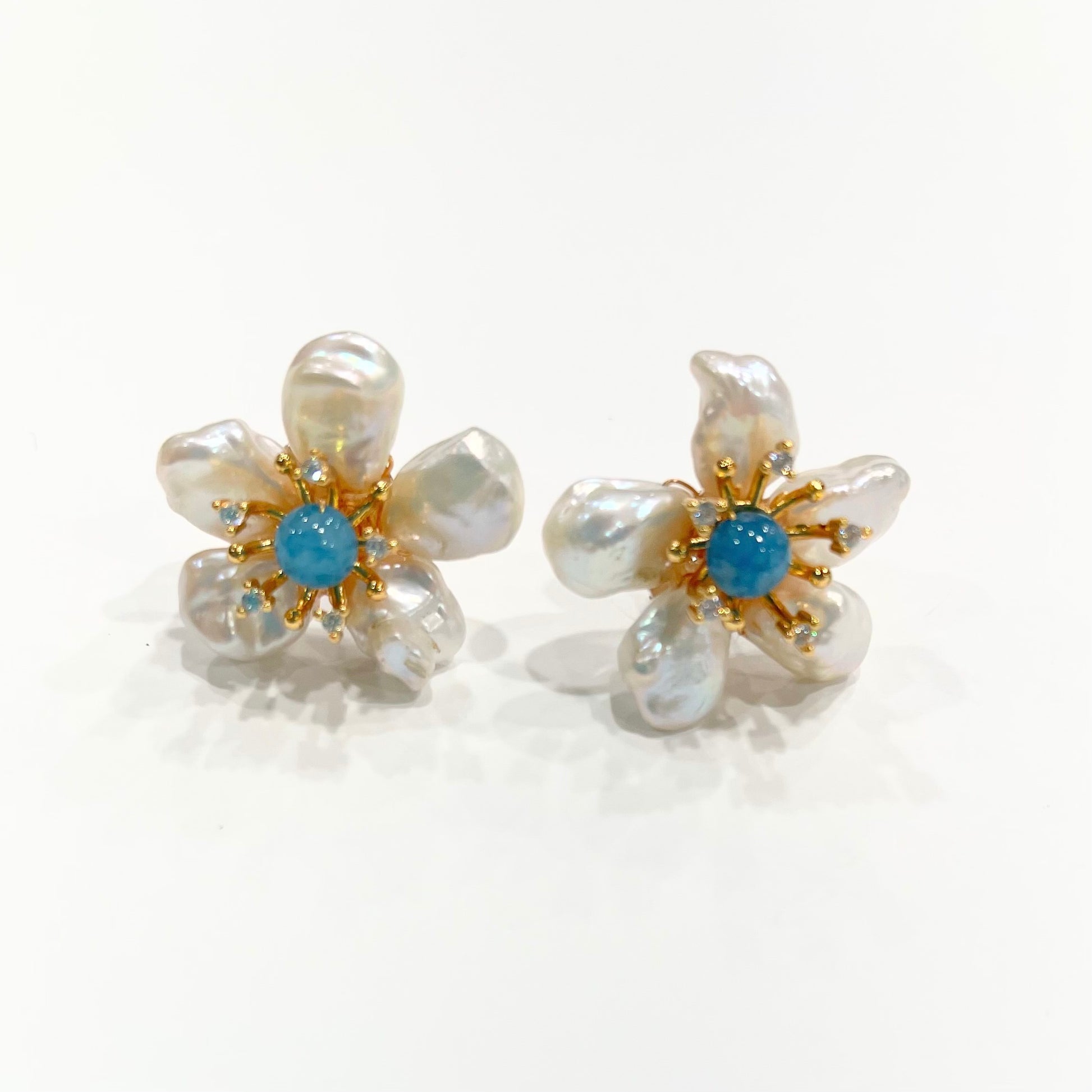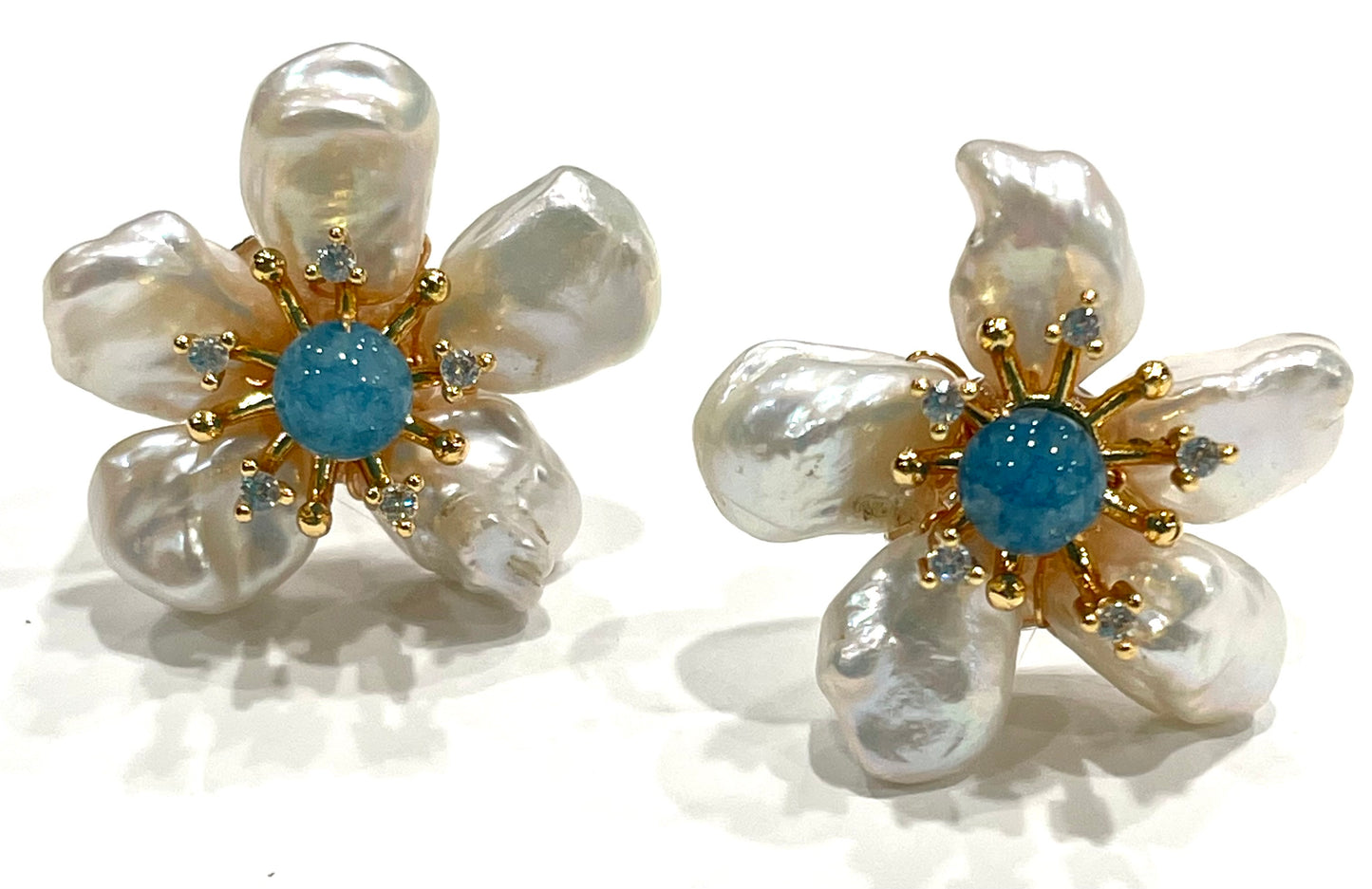 These pearl and 1” aquamarine flower earrings are elegant and statement-making. They feature natural pearls arranged in petal shapes with a blue center and sparkling cz stonesand are lightweight yet stylish.