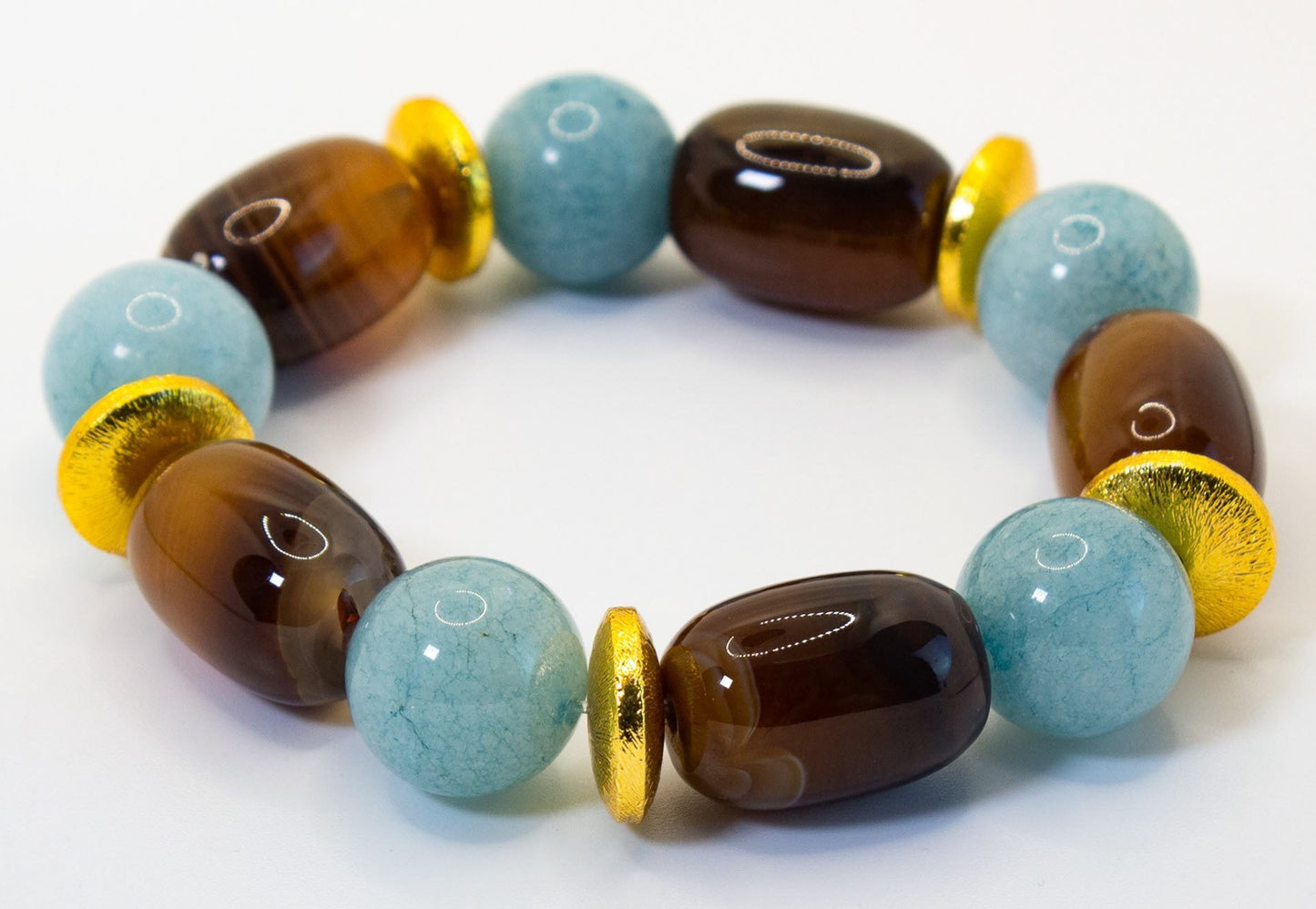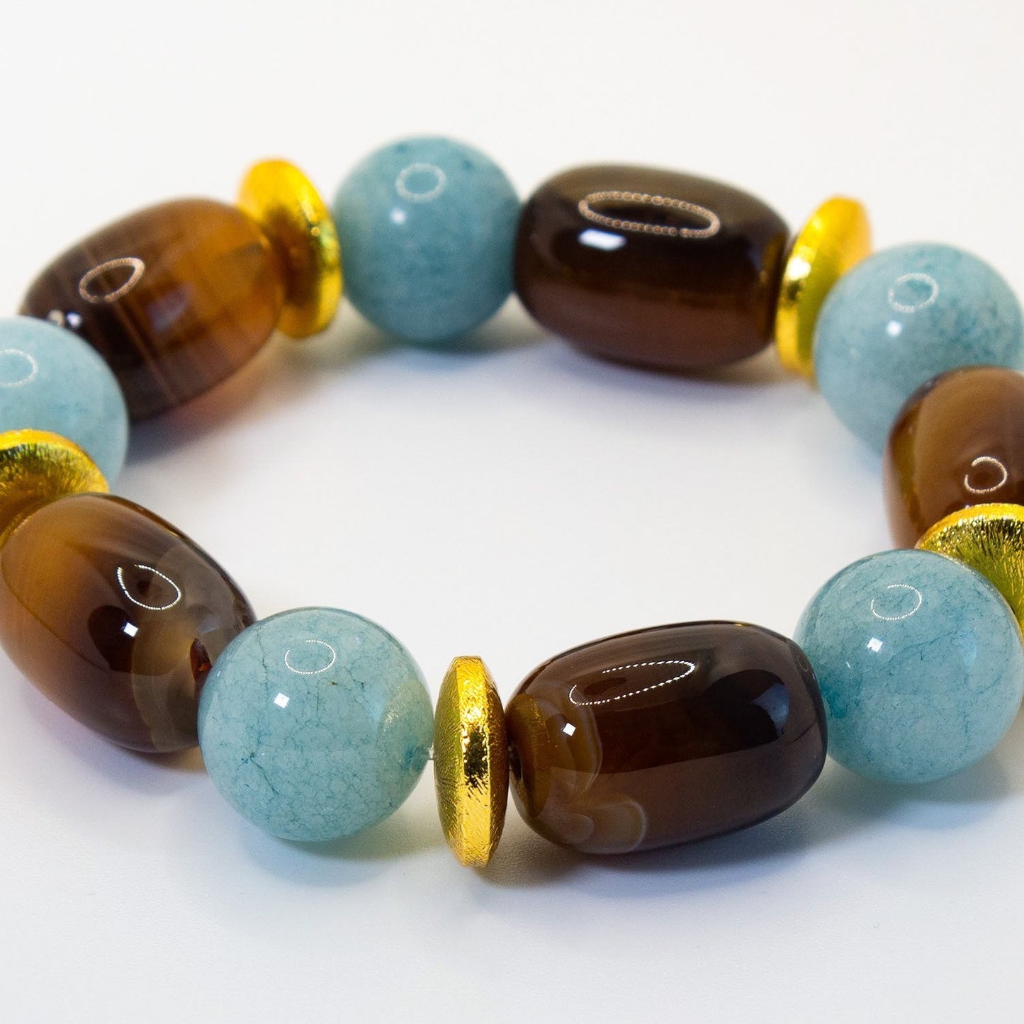 Botswana Agate & Aquamarine Gemstone Gold Statement Bracelet