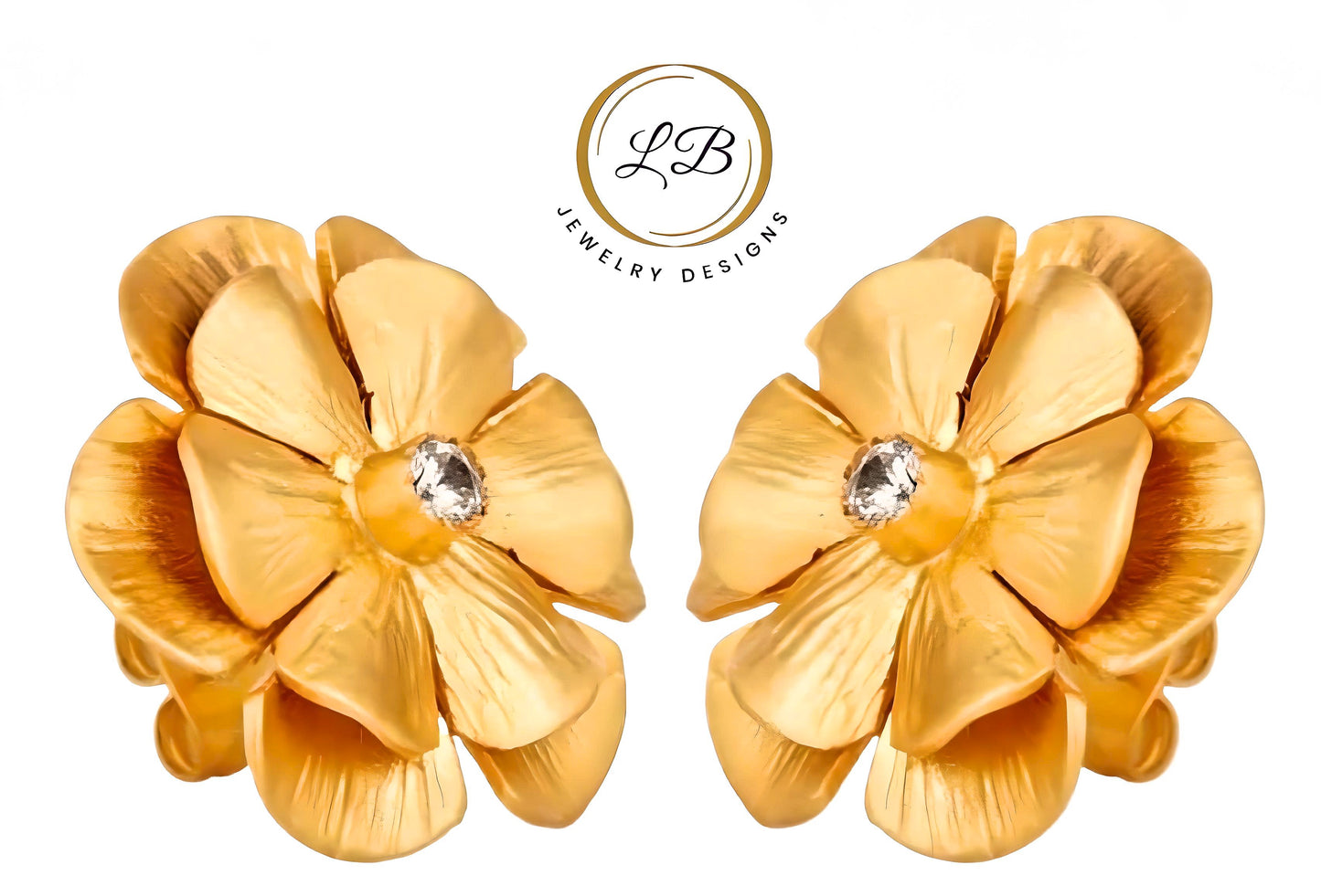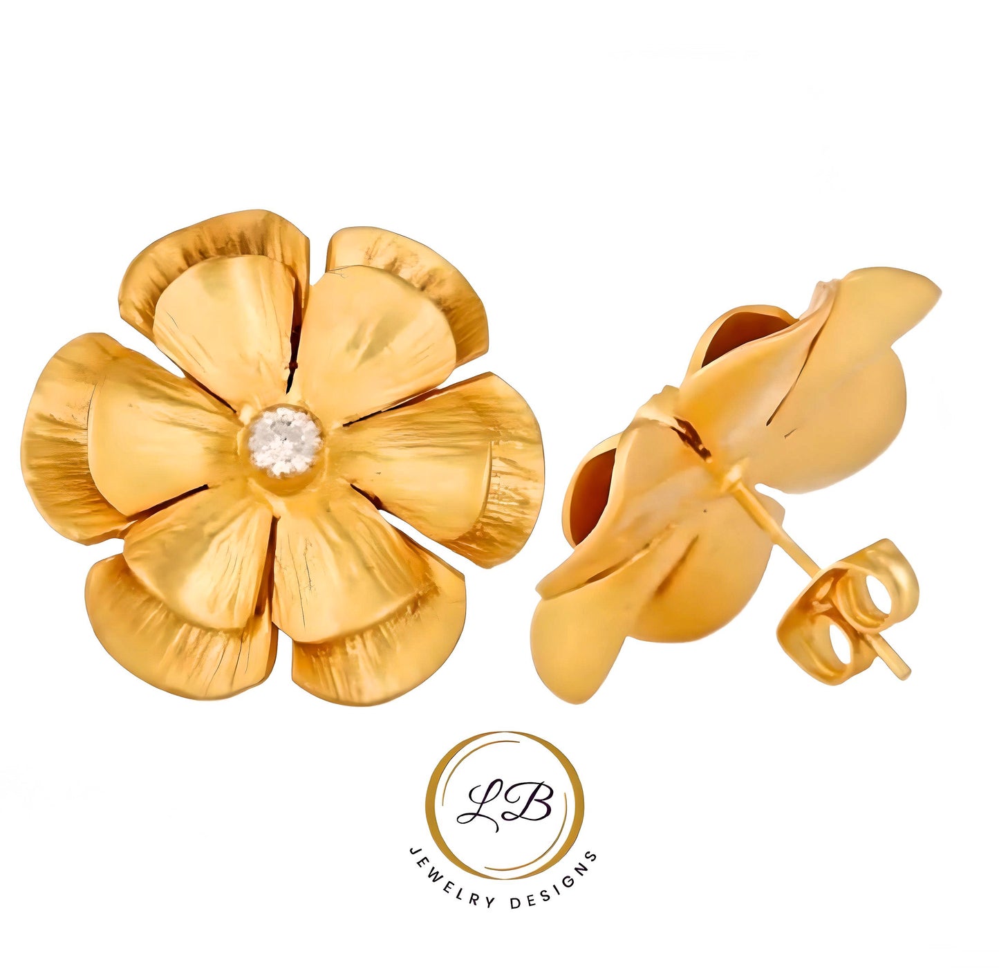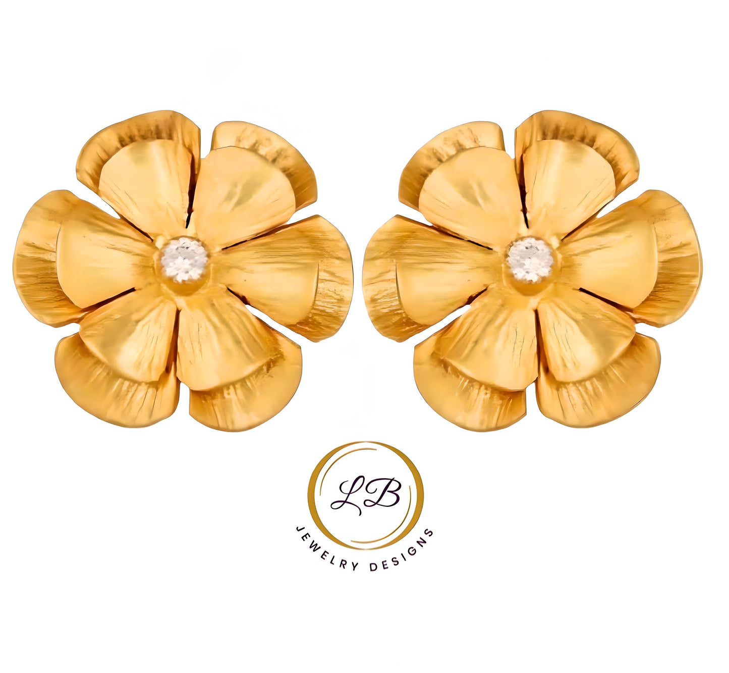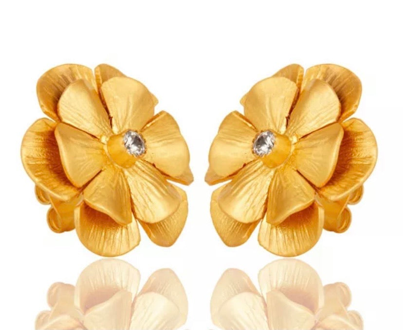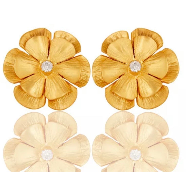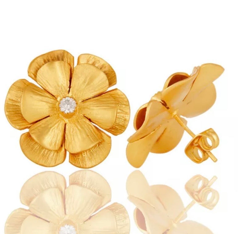Expertly crafted, these 22k brushed gold vermeil statement earrings feature a lovely flower design and a white Topaz gemstone center accent. Measuring at 1" x 1", they are the perfect lightweight addition to any outfit.