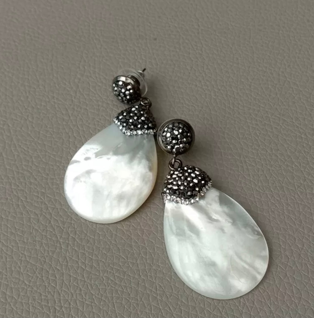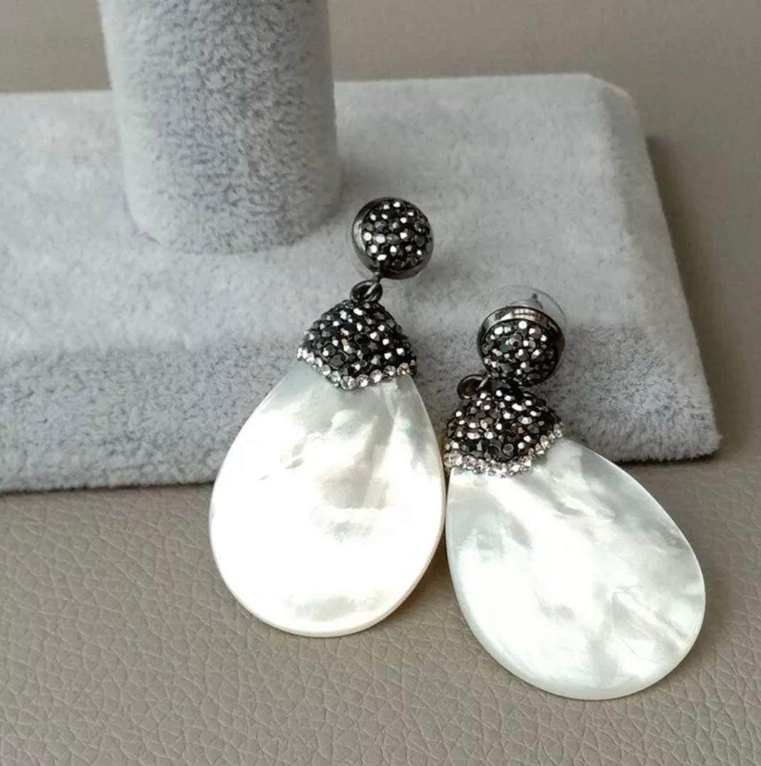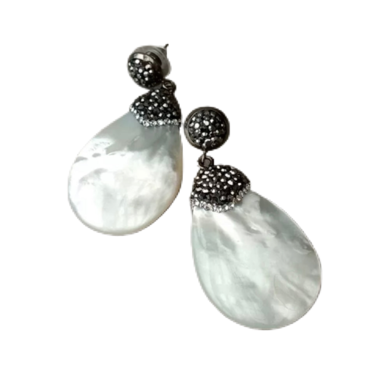 Crafted with components of Black Marcasite, stunning crystals, and tear-shaped Mother of Pearl (measuring 24mm x 38mm), these 2" earrings are the ideal way to make a sophisticated statement.