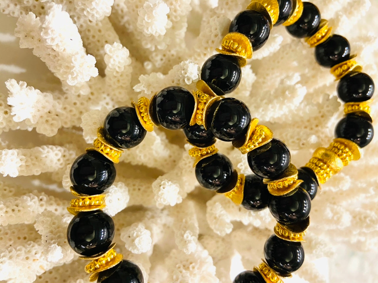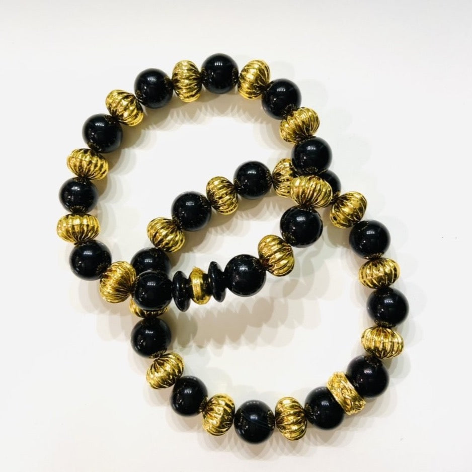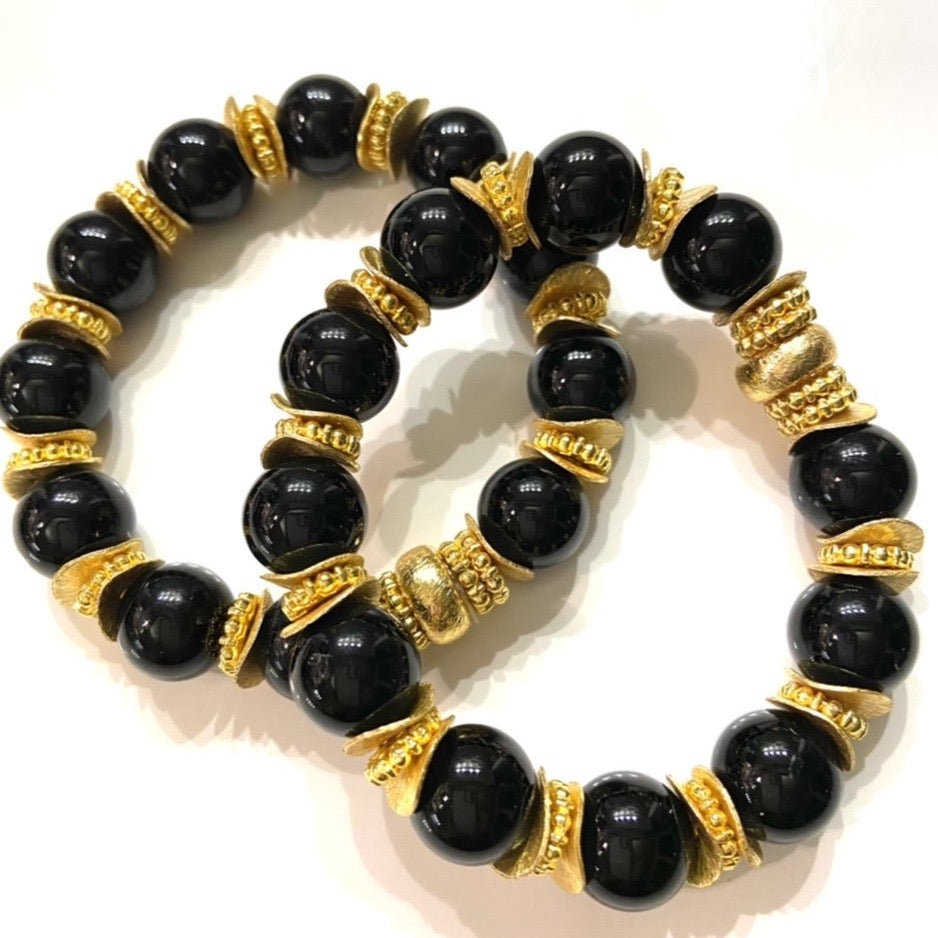Classic Black Onyx Gemstones & 18k Gold Beaded Bracelets