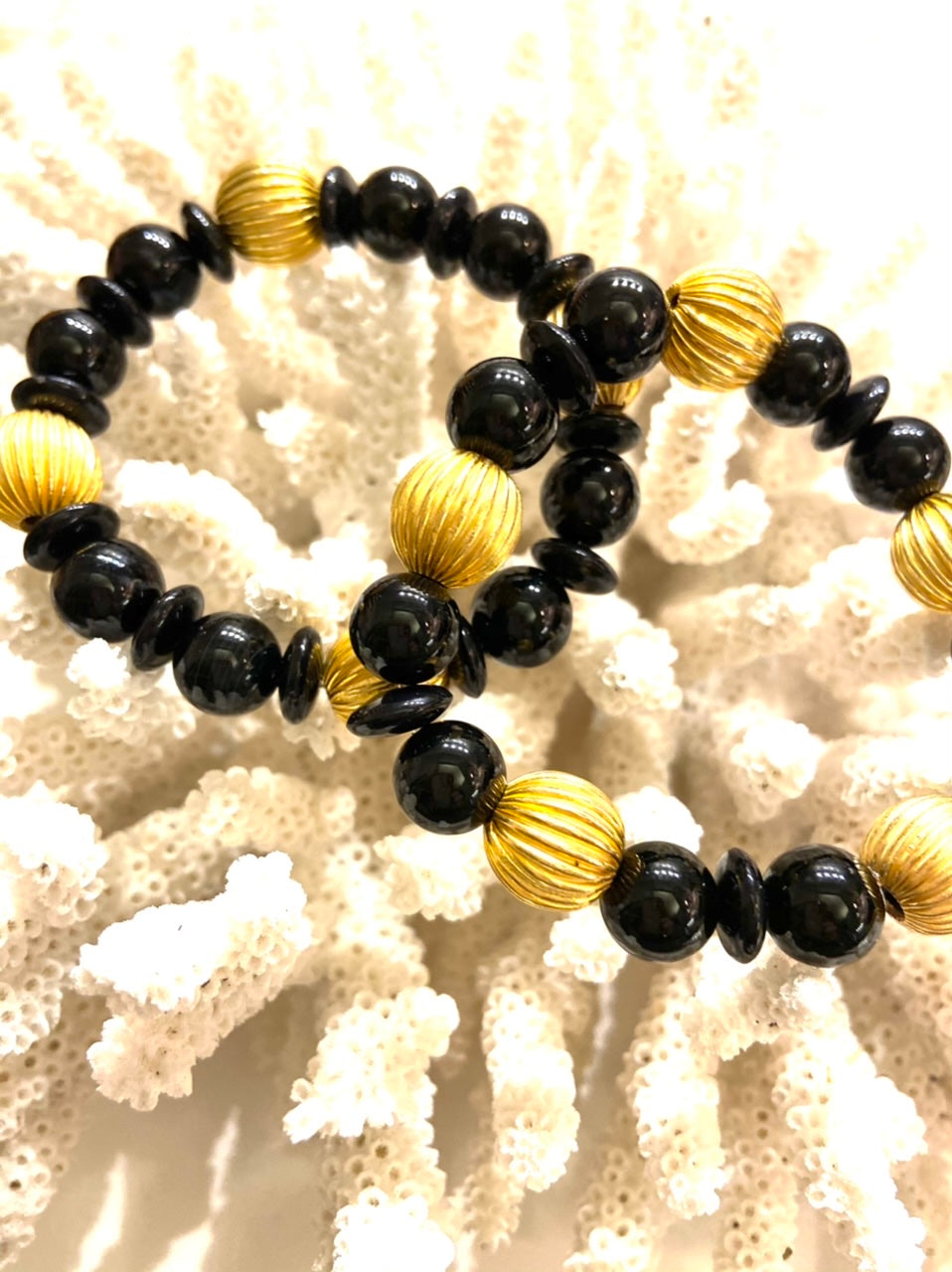 1.) Black Onyx Gemstones and 18k Gold-filled Gold Corrugated (ribbed) Beads with every other bead gold and black (2) 6.75" Stretch