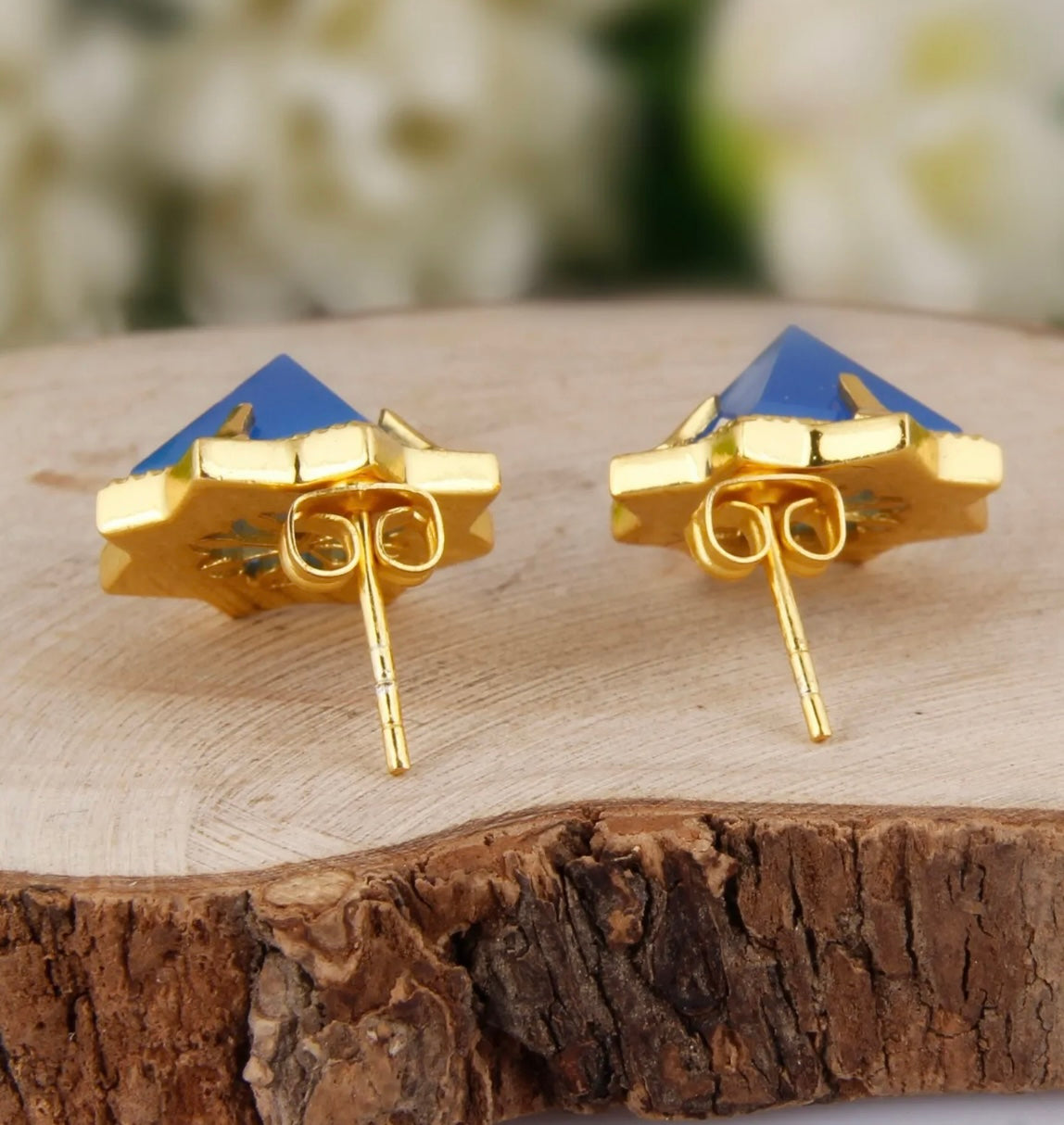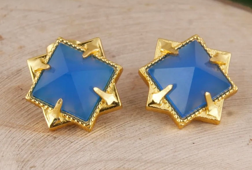 Elevate your style with these exquisite, diamond cut French Blue Chalcedony earrings. Featuring a unique pyramid shape and glistening 10mm gemstones, all set in 24k gold vermeil, these are the perfect blend of beauty and modernity.