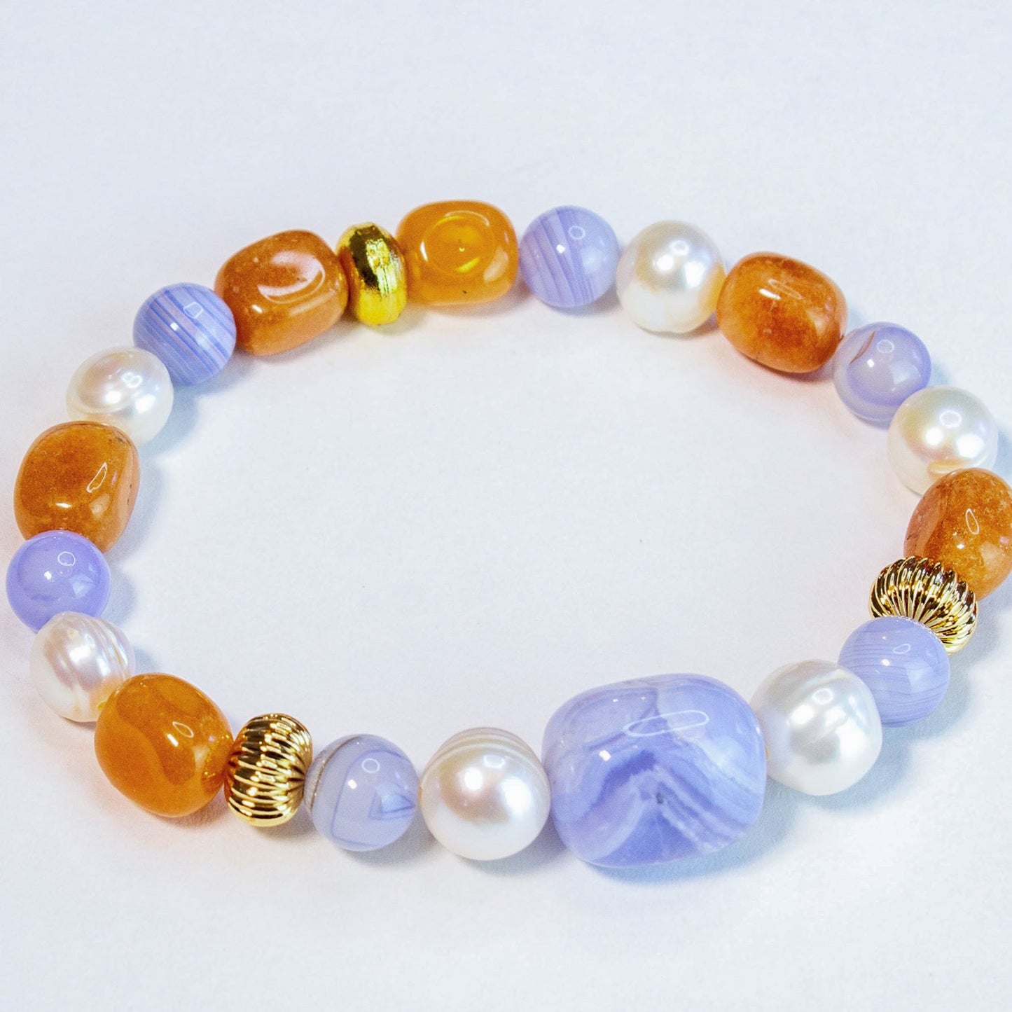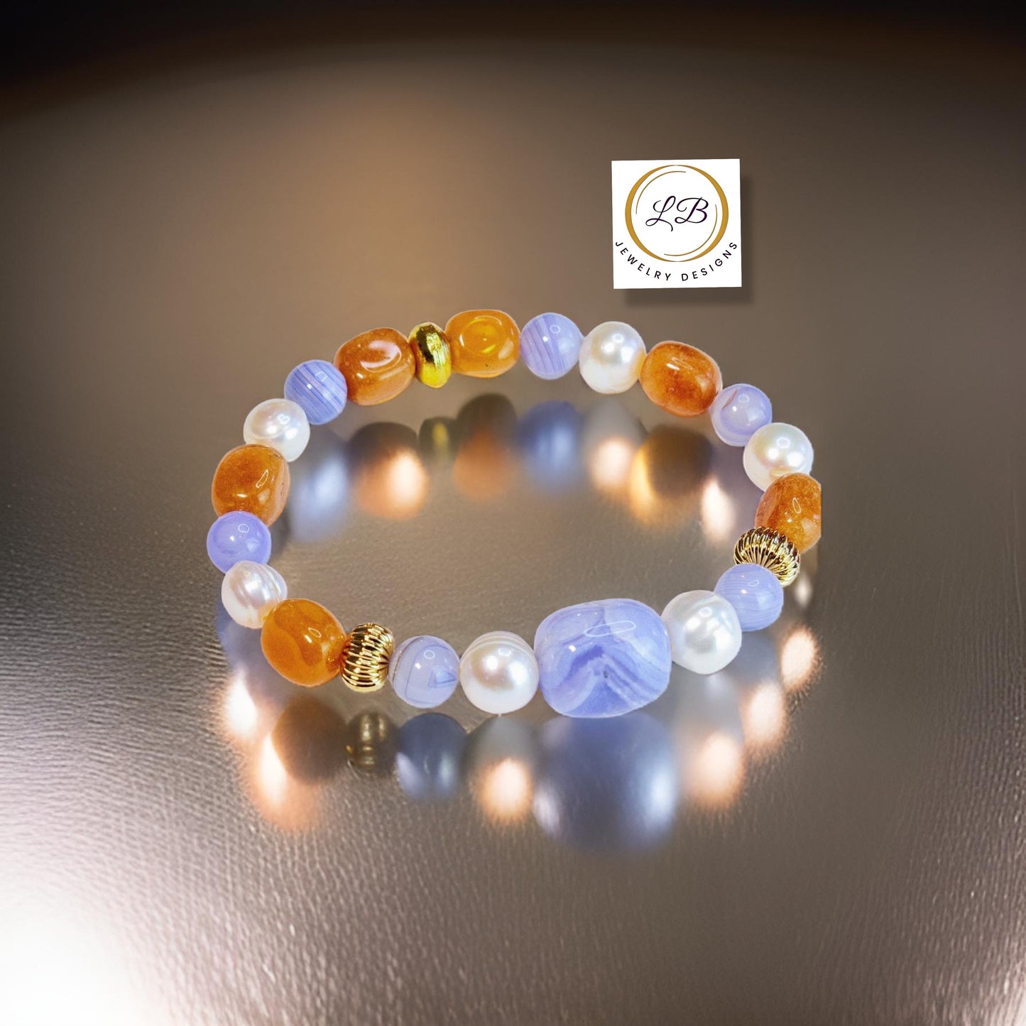 This pretty 7.25” bracelet was designed with a 16mm center Blue Lace gemstone barrel shaped bead surrounded by 12mm Freshwater Baroque Pearls, light orange Aventurine pebble-shaped stones and 10mm Blue Lace gemstones and gold-filled spacers.