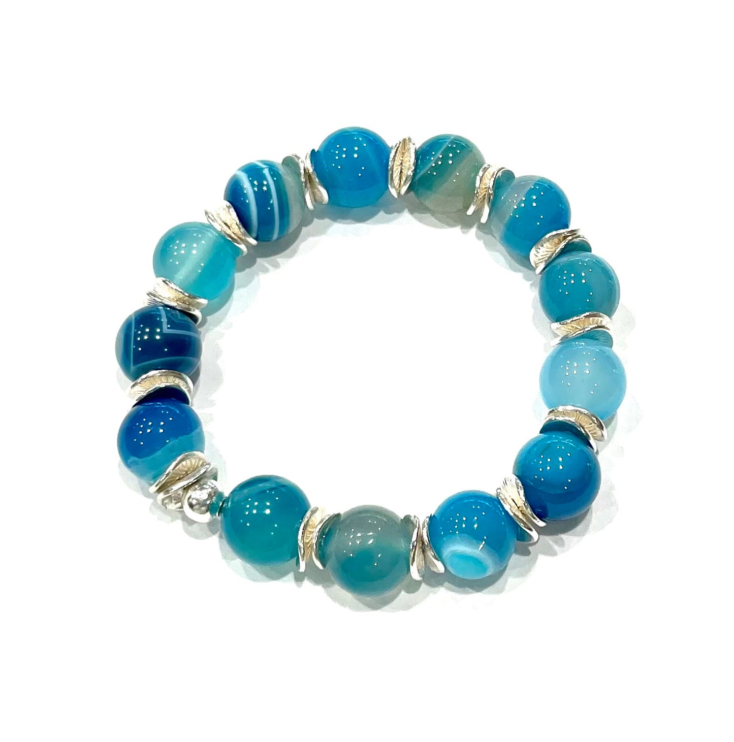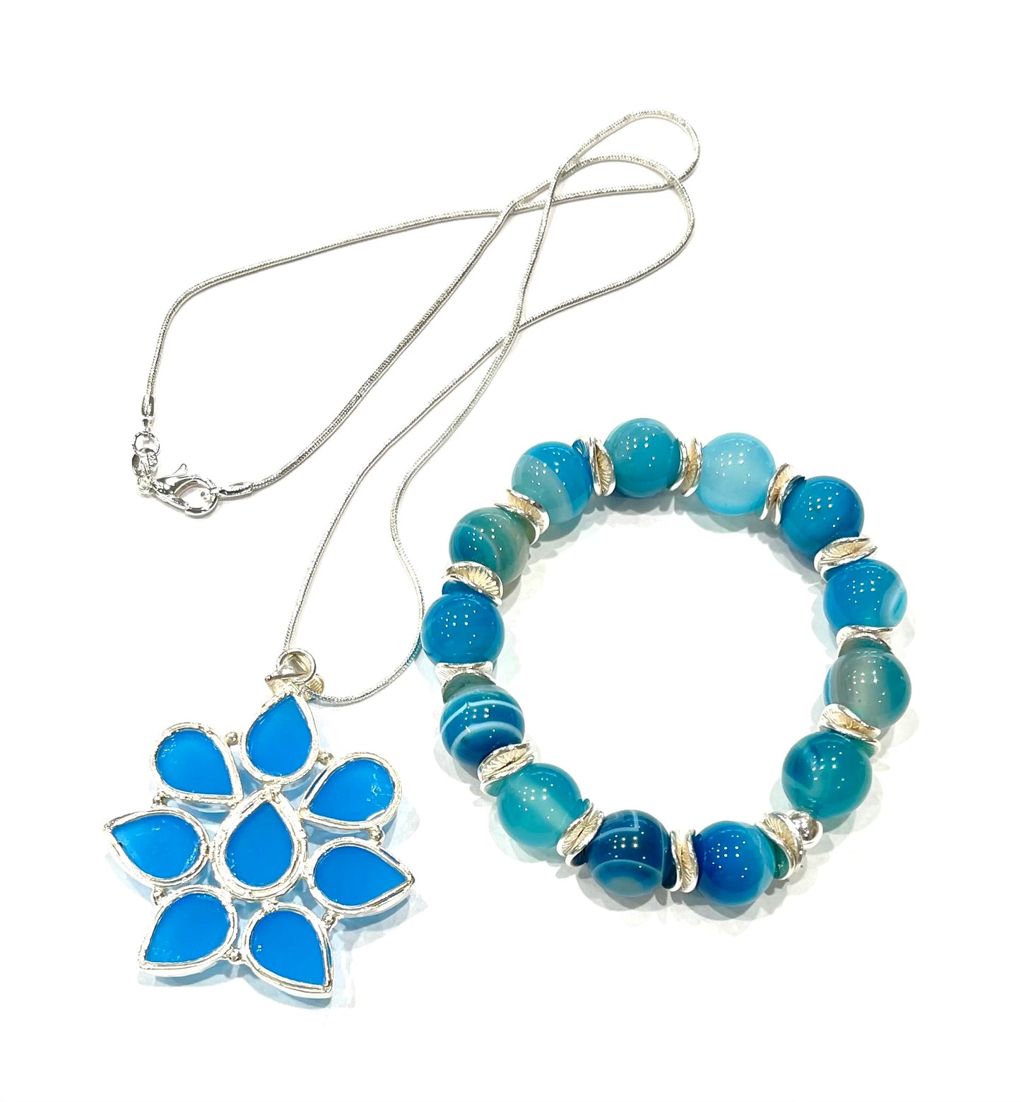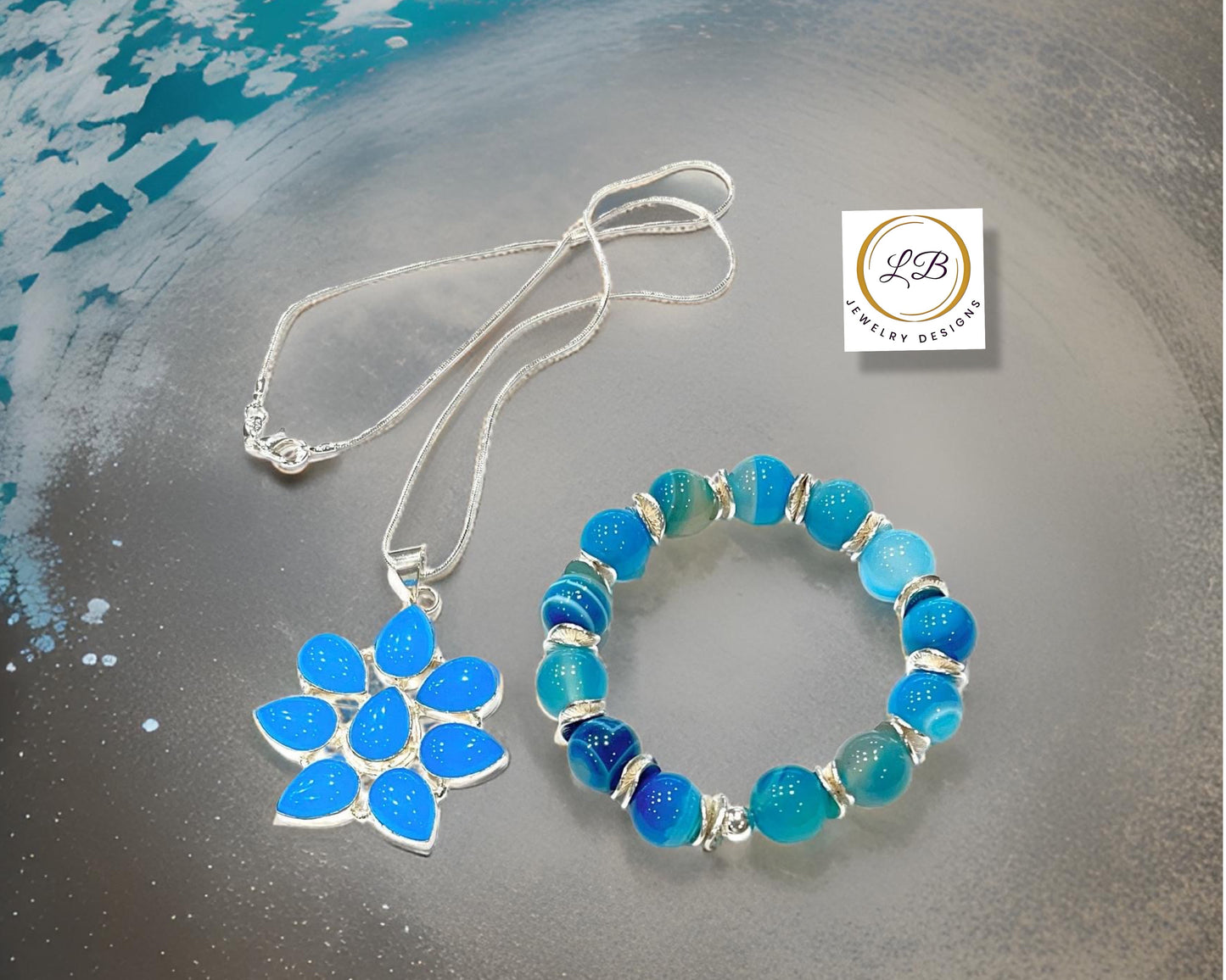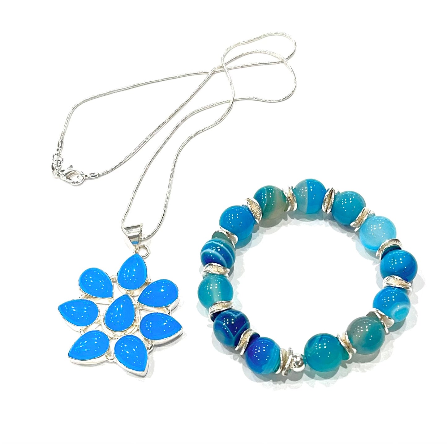 This bracelet and necklace set features a 7" beaded bracelet adorned with blue-banded agate gemstones and silver spacers. The sterling silver pendant necklace, handmade with beautiful blue chalcedony gemstones in a flower petal design, measures 2.5" and hangs gracefully from a 20" chain.