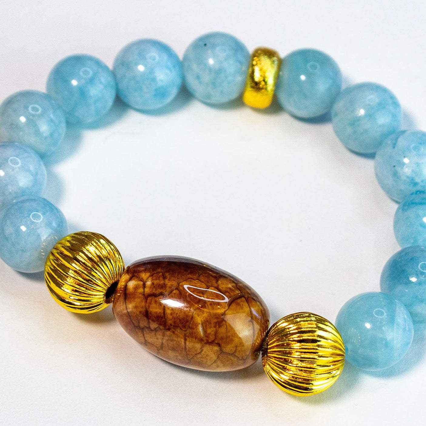 This 7" statement bracelet was designed with a pretty Botswana Espresso Brown center gemstone accented with gold-filled ribbed (corrugated) beads and (12mm) Aquamarine gemstones.