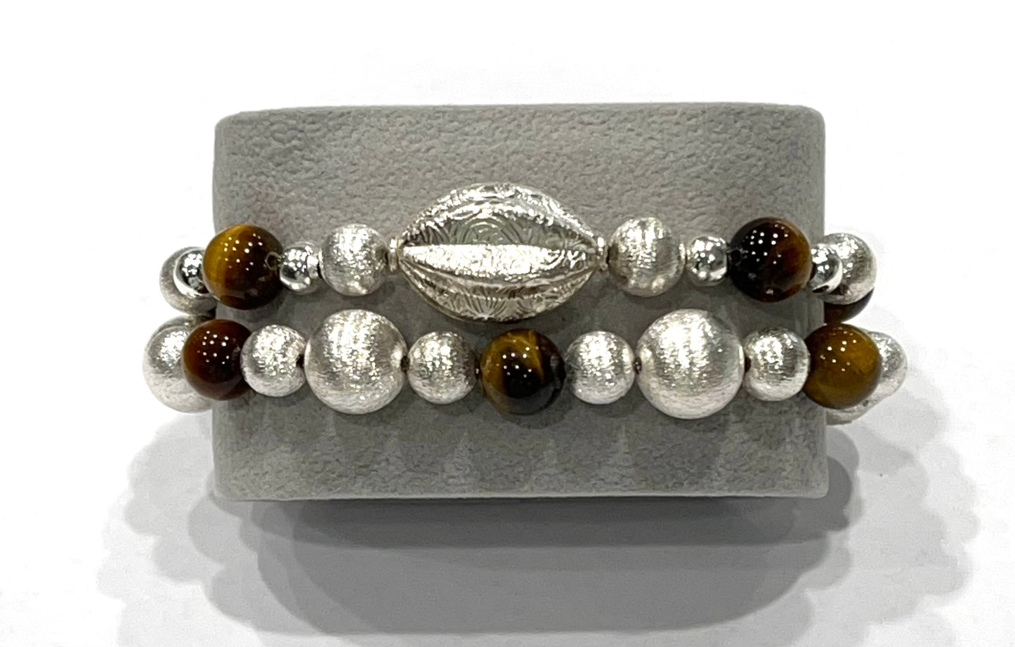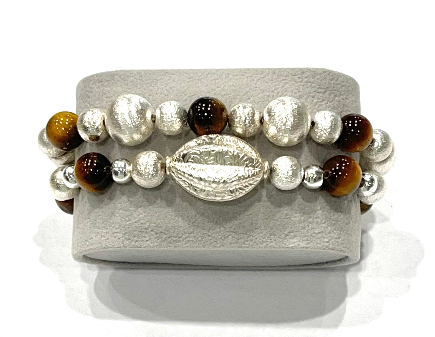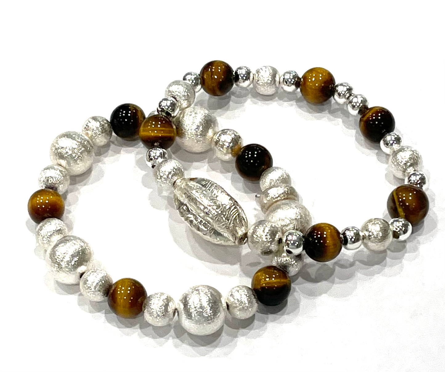 This is a pretty gemstone bracelet set designed with brown Tiger’s Eye gemstones (12mm), silver accents, sterling silver beads (12mm) and a melon-shaped Bali silver center bead.