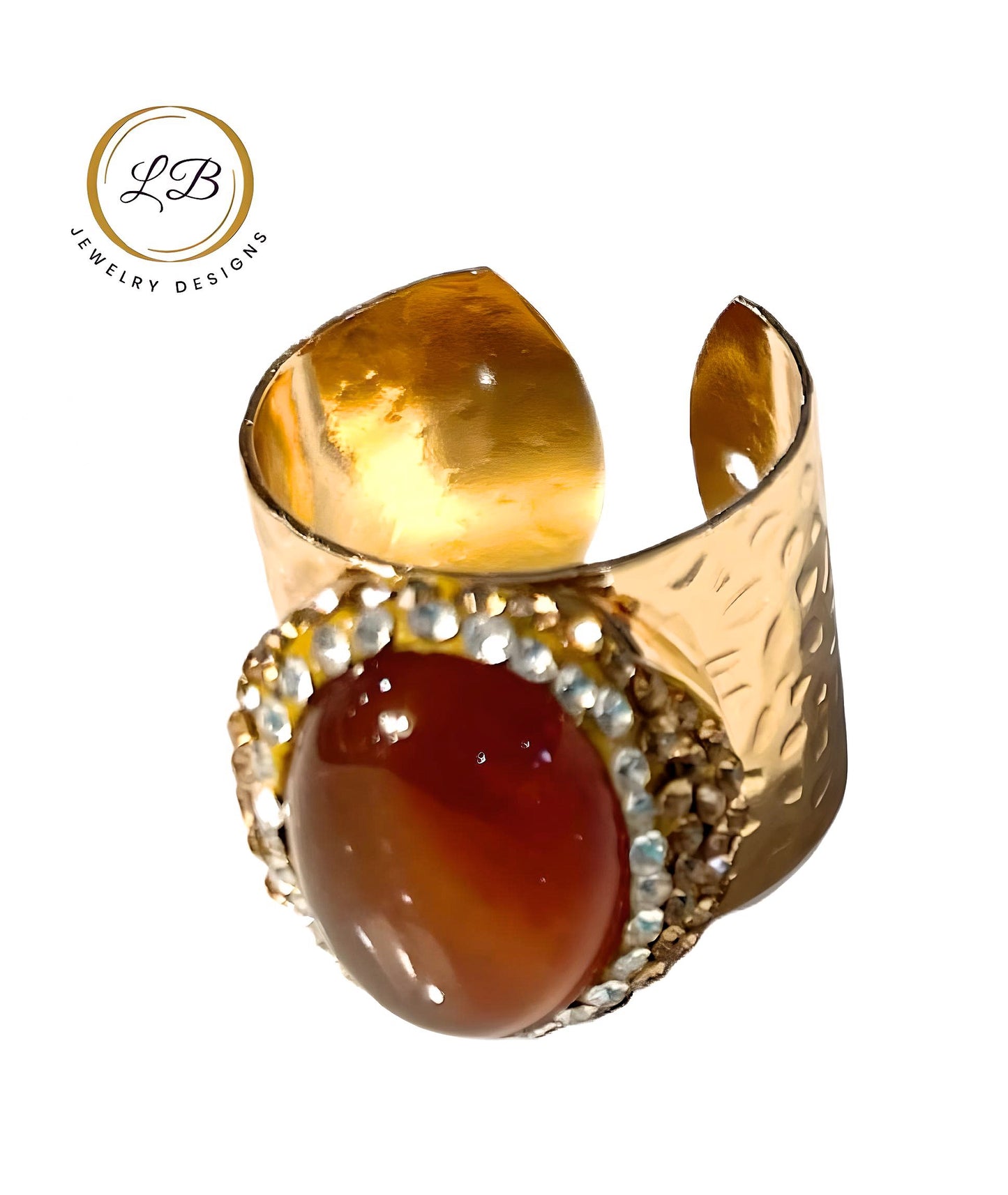 Designed with skill and attention to detail, this exquisite Carnelian gemstone ring showcases a .925 sterling silver base and a textured 18k rose gold overlay. Its sophisticated cigar-style band is embellished with a center deep Orange Carnelian gemstone, surrounded by Swarovski crystals and hematite accents. The adjustable size range of 5.5 to 9 makes this ring a must-have for any jewelry enthusiast.