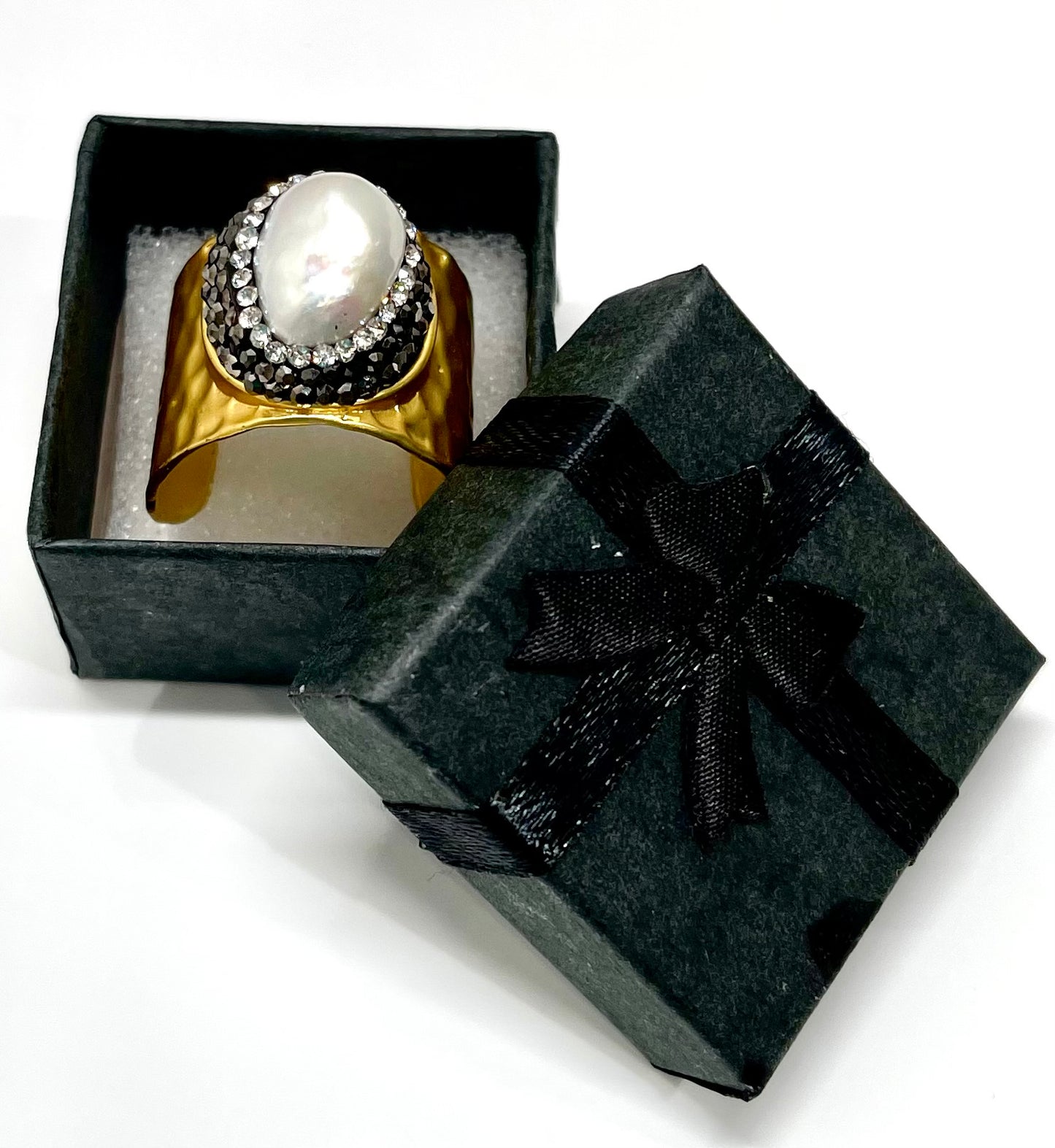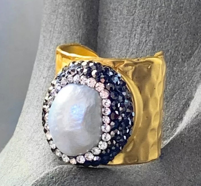 Expertly crafted, this stunning statement ring showcases a hammered 18k gold-plated hammered band in a cigar-style design, adorned with a white Baroque Pearl and sparkling pave and Marcasite crystals. With its adjustable size range of 5.5 to 9, this ring offers both elegance and versatility. Each baroque pearl is unique and genuine, making each setting one-of-a-kind.
