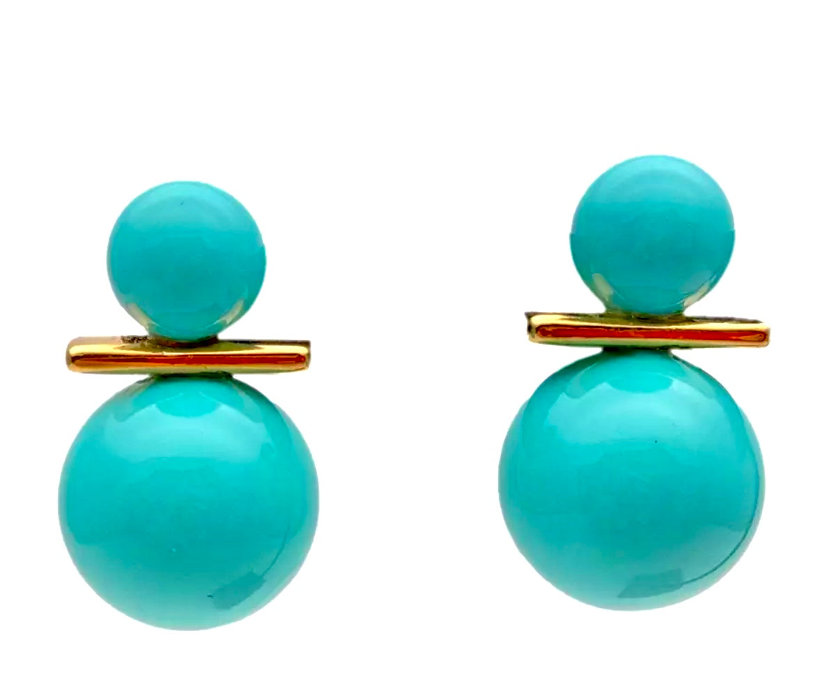 Colorful & Classic Turquoise Stud Earrings are designed with shell pearls, color enhanced with a pretty turquoise blue (8.5mm & 14mm), 18k gold plate.