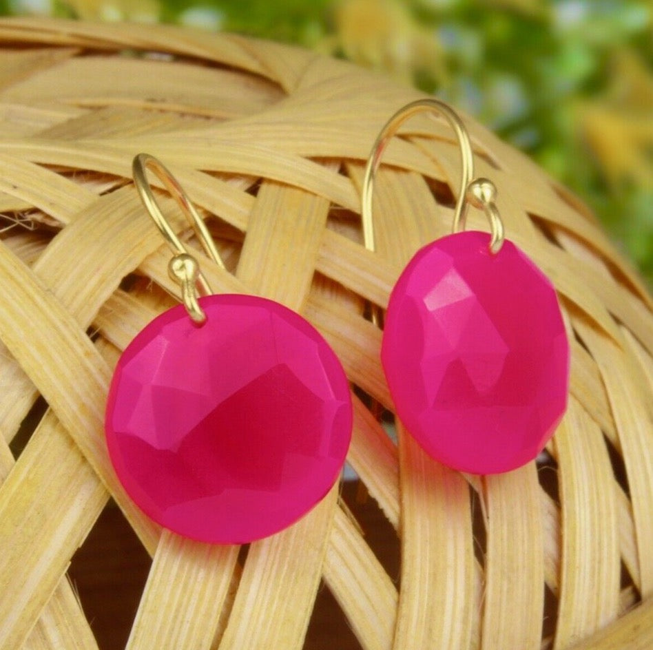 These earrings are so colorful designed with 15mm bright pink Chalcedony gemstones and 18k gold plated dangle hooks.