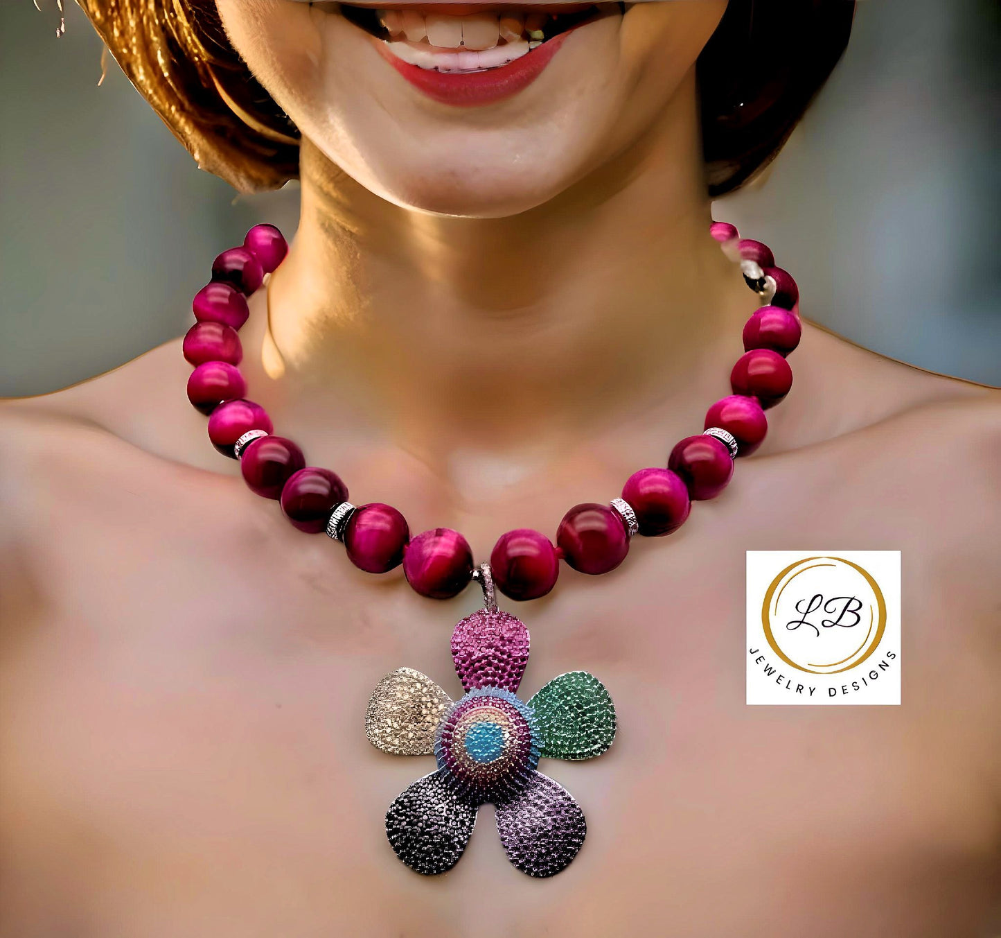 Experience the luxury of our 24" Vivid Fuchsia Tiger's Eye & Colorful Pave Flower Pendant Necklace. Featuring 14mm Pink Raspberry Tiger's Eye stones and a 2" flower pendant adorned with multi-colored crystals, this exclusive necklace boasts an elegant silver clasp. Pink Tiger's Eye is known for its calming effects, promoting emotional healing and balance, as well as stimulating creativity and intuition. Its pink hue adds an element of charm and sophistication.