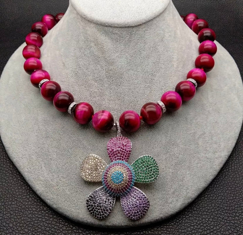 Vivid Fuchsia Tiger’s Eye & Pave Flower Pendant Statement Necklace 24”