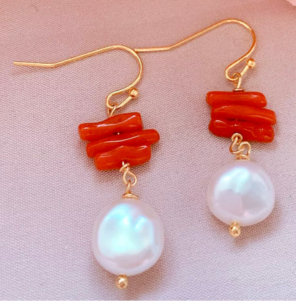 Irregular Sapling-Shaped Coral Baroque Pearl Drop Earrings