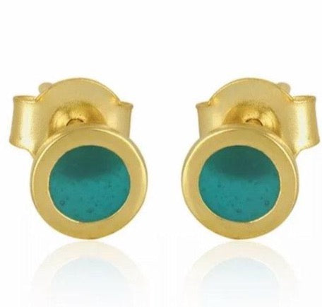These dainty (tiny) earrings for perfect for the minimalist in your life or for young girls. It is approximately 6mm in diameter and made with 24k gold plate and a center green enamel stone.
