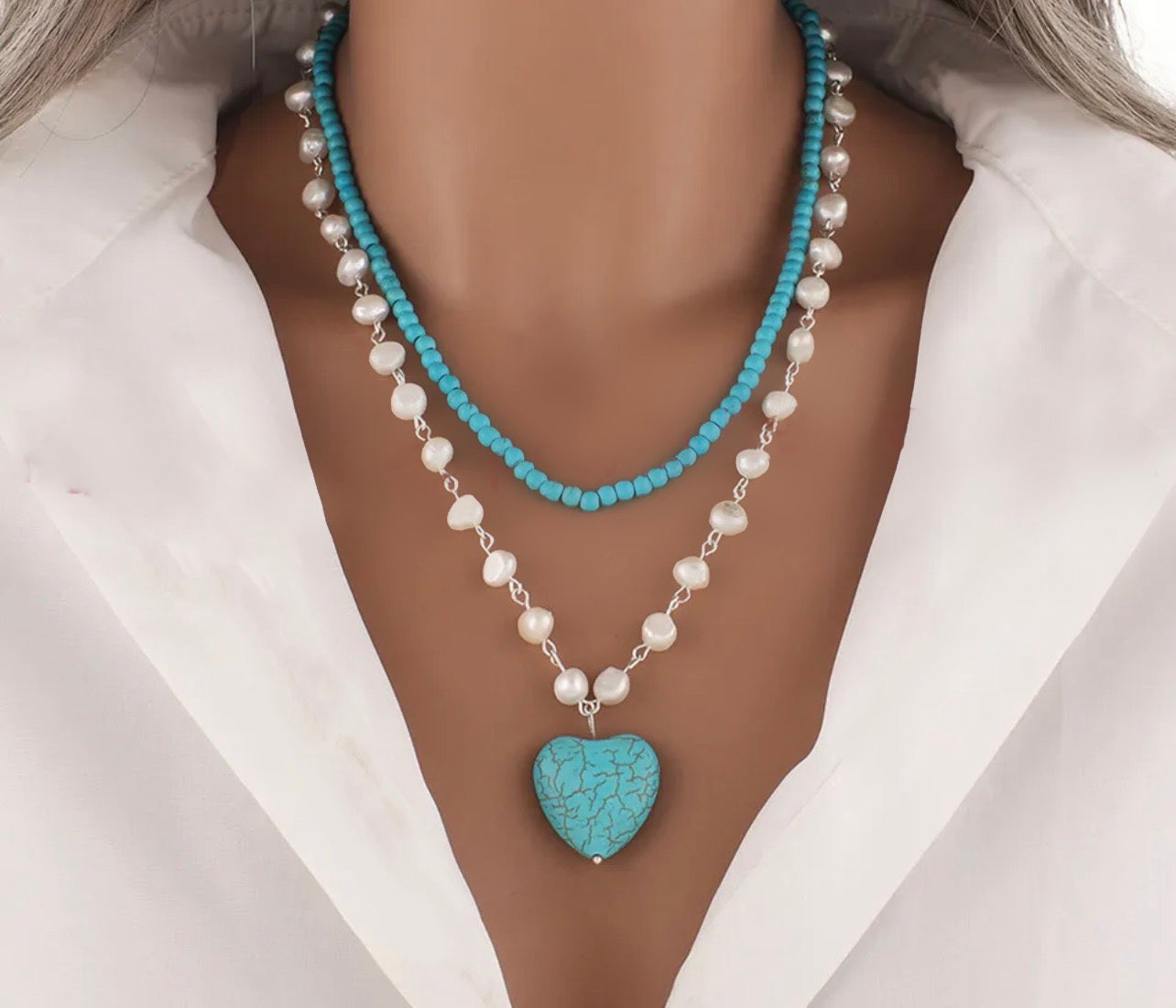 This double-strand necklace features a sterling silver chain measuring 20" and adorned with 4mm white baroque pearls. A 1" turquoise heart pendant is attached to the longer strand, while the shorter 17" chain is made with 2mm turquoise natural gemstones. Both strands are secured with a silver clasp.