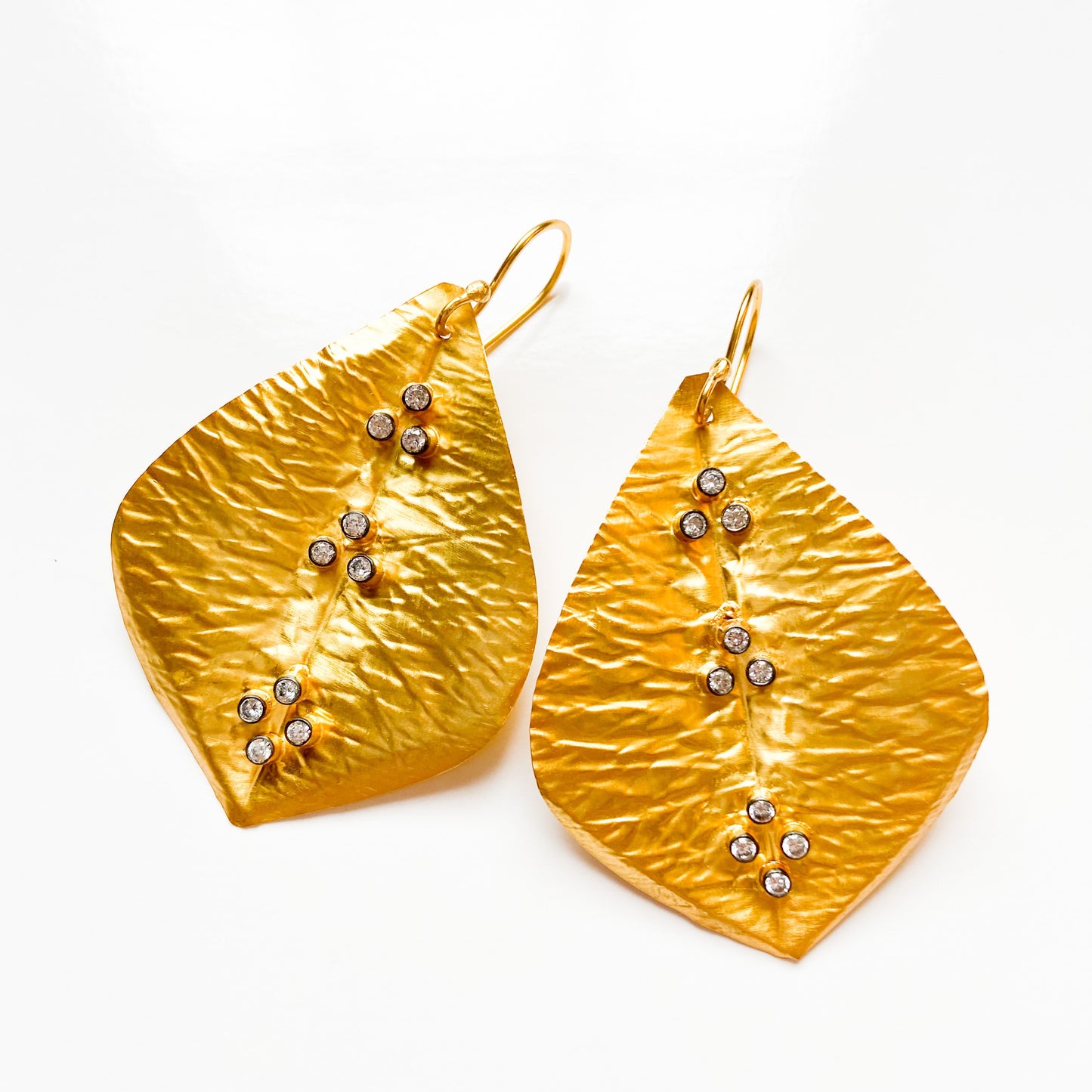 Hammered 22k Yellow Gold Leaf and White Topaz Statement Earrings 2.5”
