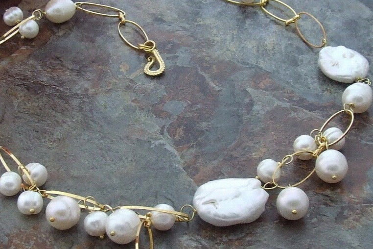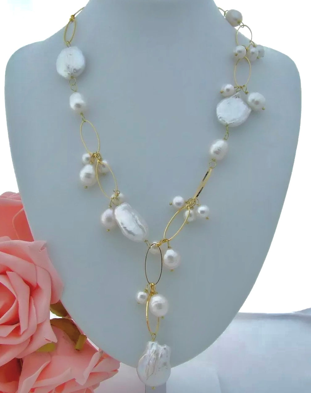 Enhance any look with this exquisite statement necklace featuring freshwater pearls in white round, rice, and keshi shapes. The sparkling pearls are complemented by an adjustable 18k gold plated clasp and can be worn with or without the pendant drop, giving you flexibility in styling. Dimensions include: 9-10mm for round pearls, 11x13mm for rice pearls, and 20x22mm-20x26mm for keshi pearls.
