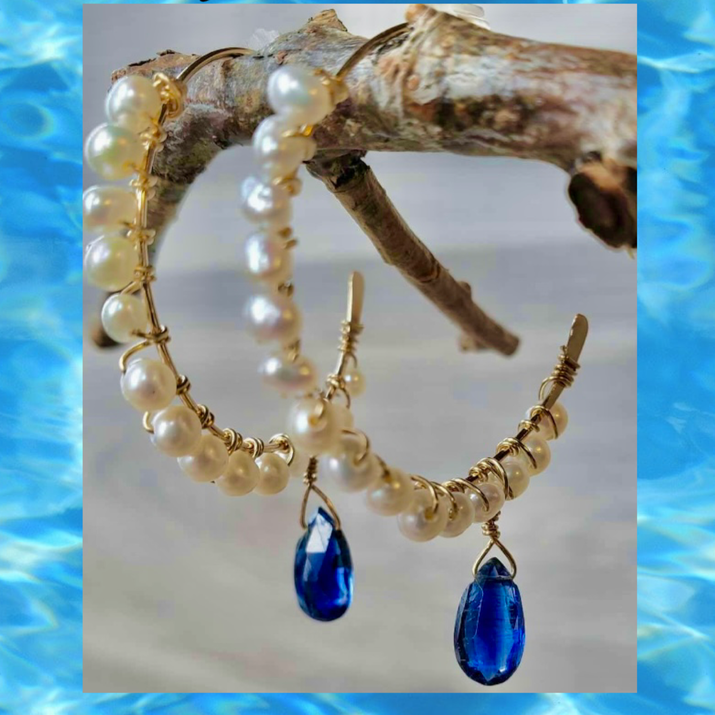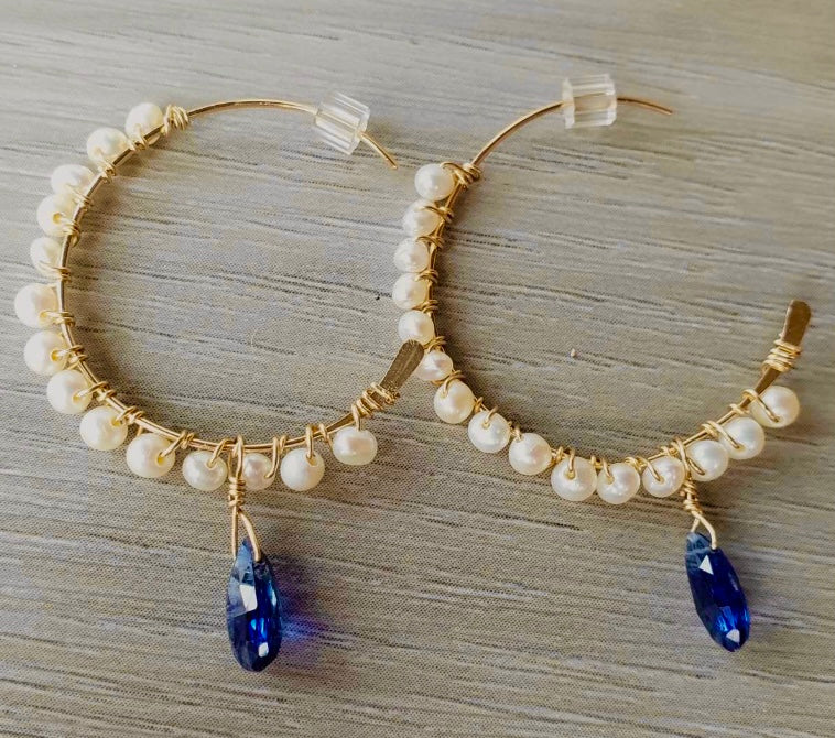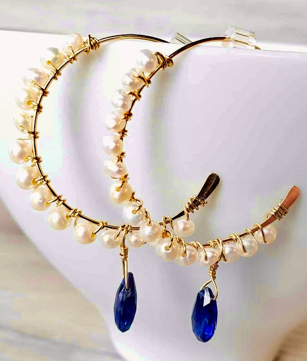These 14k Gold Filled hoops feature hand-hammered edges and hand-wrapped tiny freshwater pearls, creating a lightweight, 26mm hoop adorned with a deep blue Kyanite gemstone.