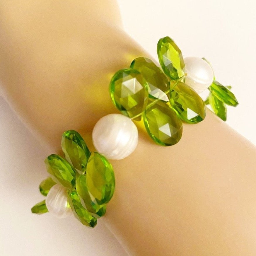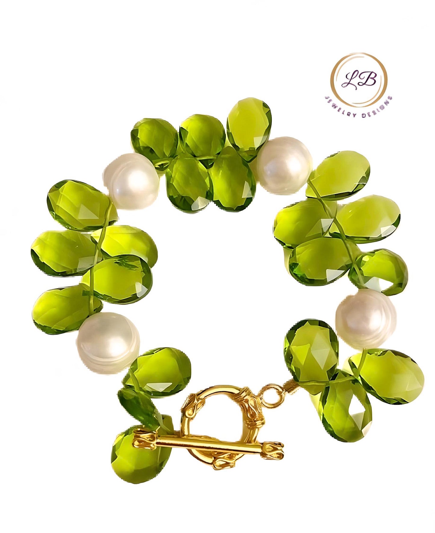 Elegant Light Green Peridot Briolette-cut Gemstone Bracelet with Pearls