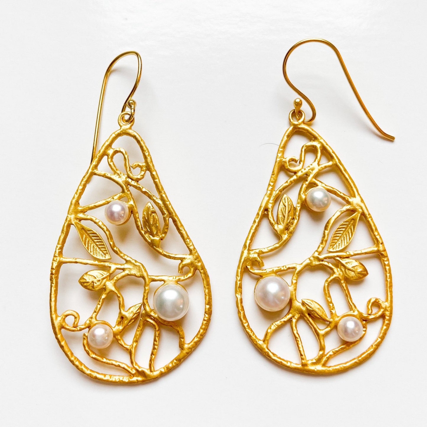 Experience luxury with these exquisite 2.75" drop dangle earrings, featuring a gleaming pear-shaped leaf design crafted from 24k gold vermeil and adorned with three lustrous freshwater pearls. The ultimate statement of sophistication and style, these elegant earrings will surely elevate any ensemble.