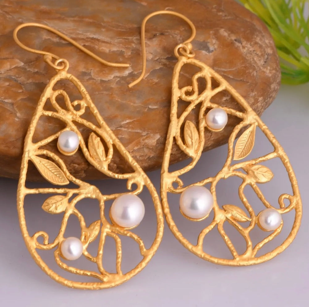 24k Gold Vermeil and Pearl Statement Dangle Earrings 2.75”