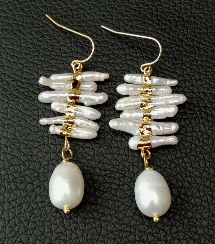 Experience the elegance and sophistication of our 2" statement earrings, featuring baroque pearl drops and freshwater cultured white Keshi Biwa Pearls. The 18k gold vermeil enhances the luster of these earrings, with a diameter of 10x11mm (pearl) and 21x22mm (keshi pearl). Discover the beauty of nature's treasures with our expertly crafted earrings.