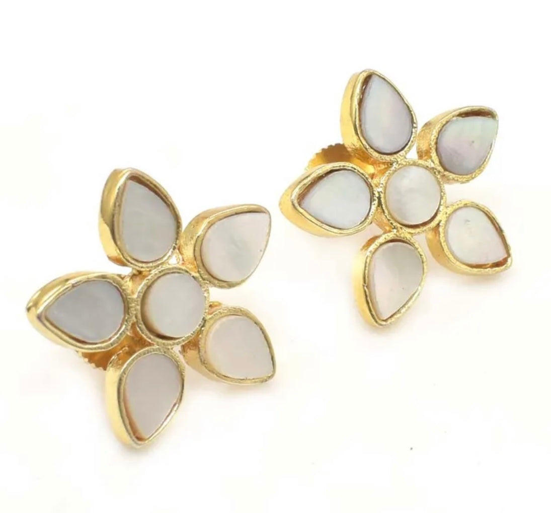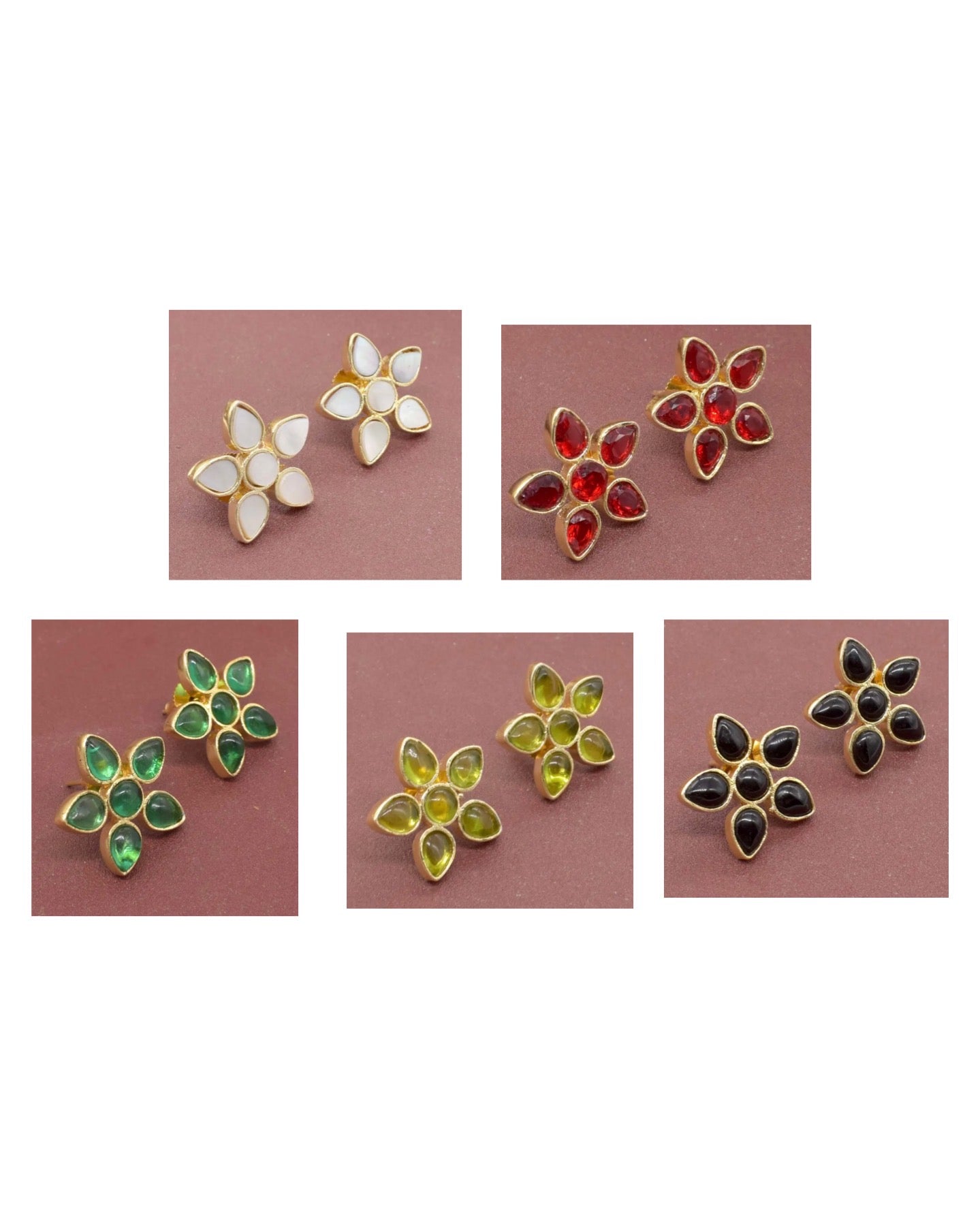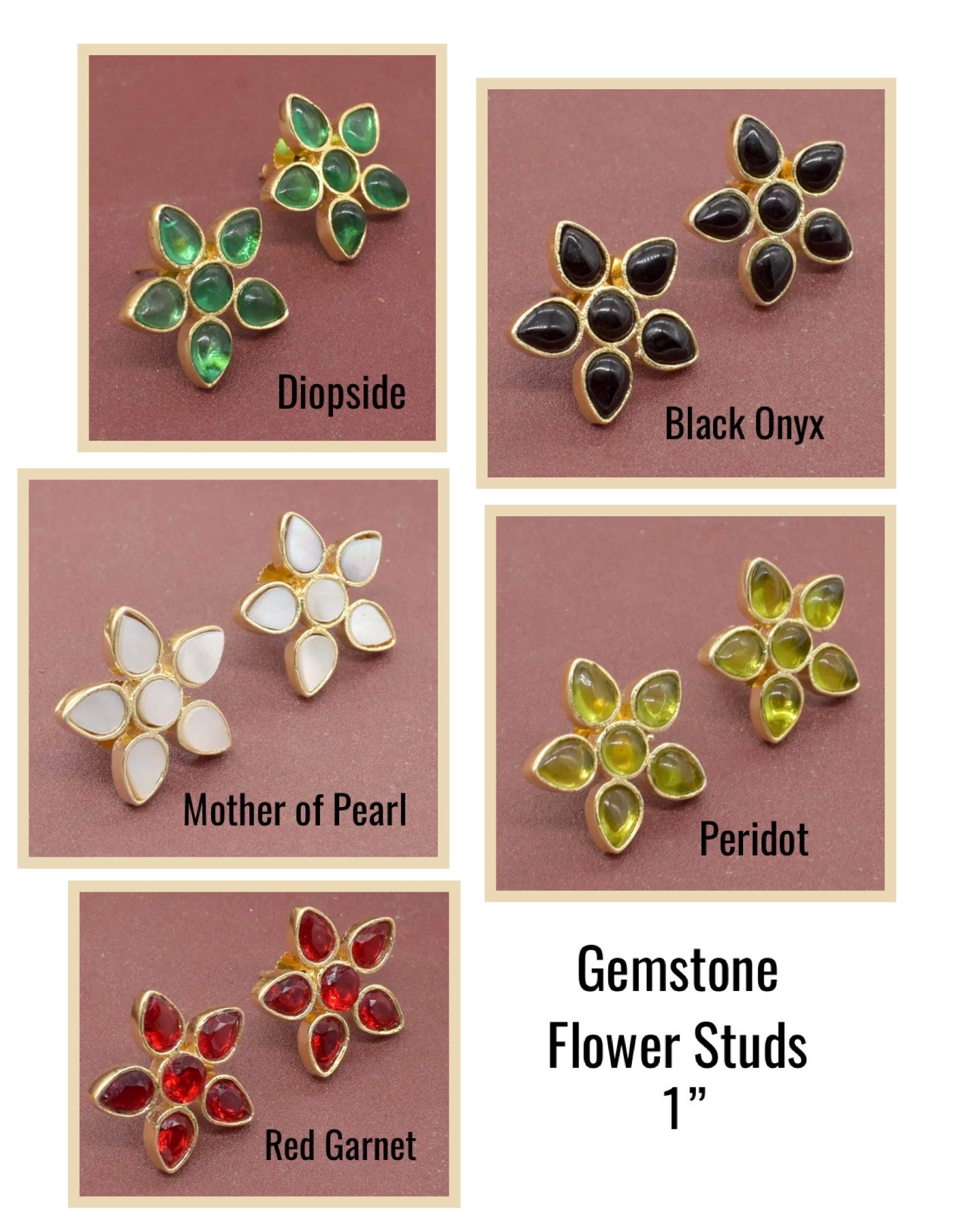 Expertly crafted with a variety of gemstones including Diopside, Black Onyx, Mother of Pearl, Peridot, and Red Garnet, these elegant Quartz flower gold stud earrings measure 1 inch. Perfect for adding a touch of sophistication to any outfit.