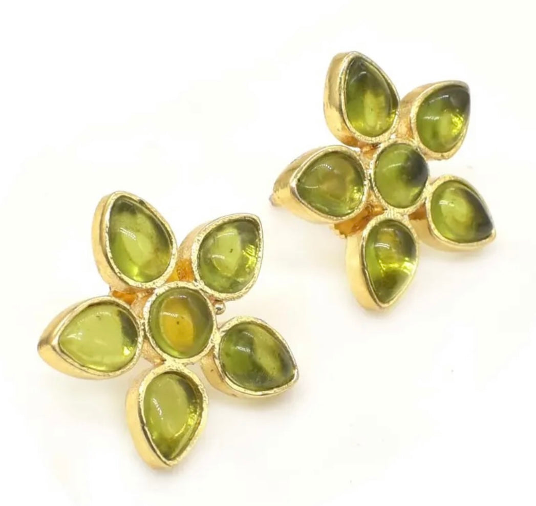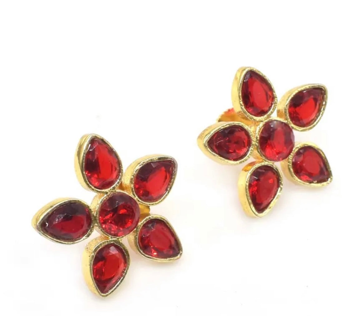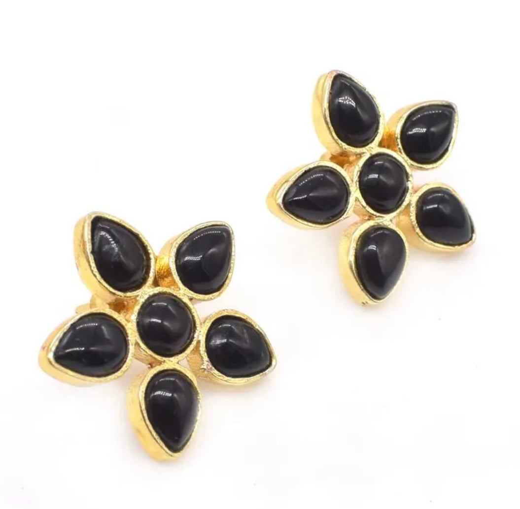 Expertly crafted with a variety of gemstones including Diopside, Black Onyx, Mother of Pearl, Peridot, and Red Garnet, these elegant Quartz flower gold stud earrings measure 1 inch. Perfect for adding a touch of sophistication to any outfit.
