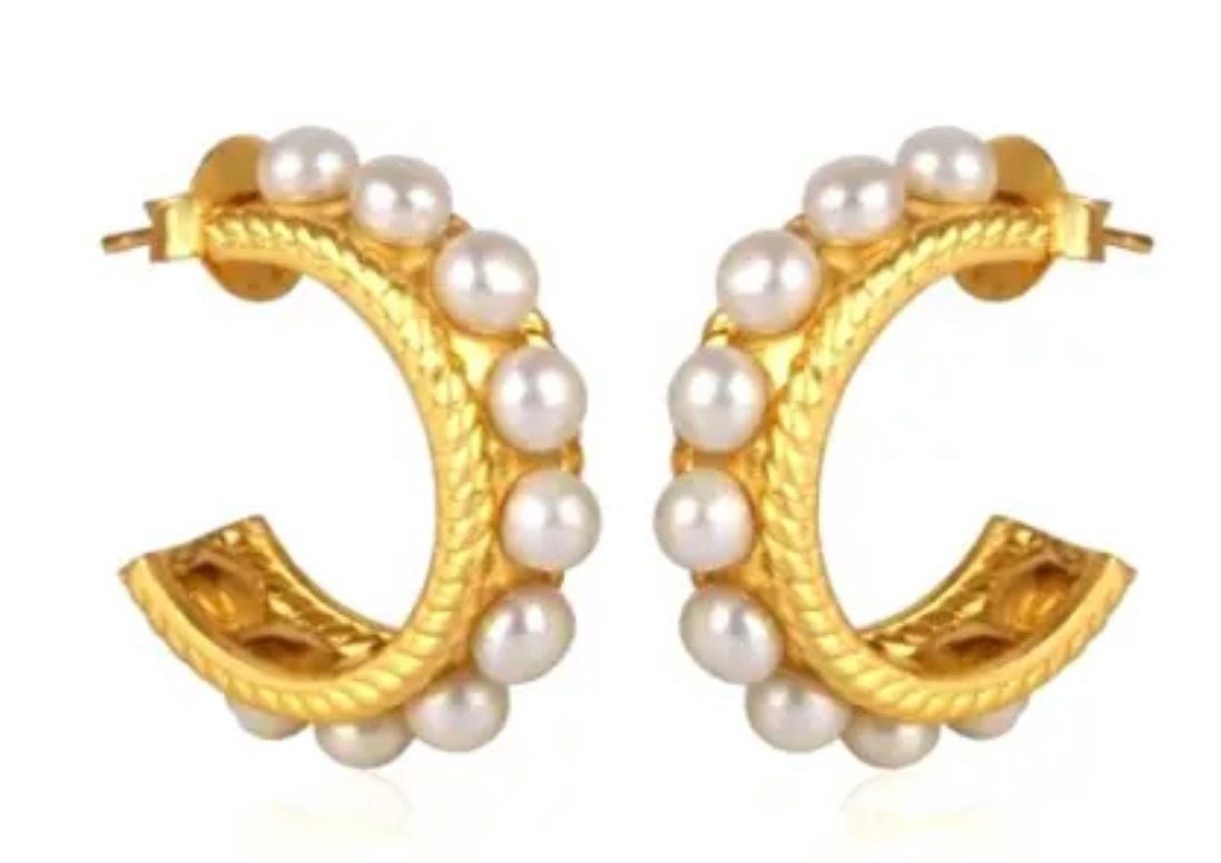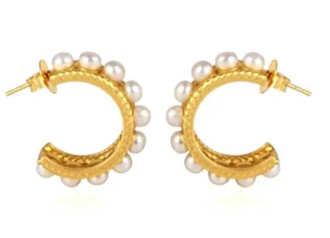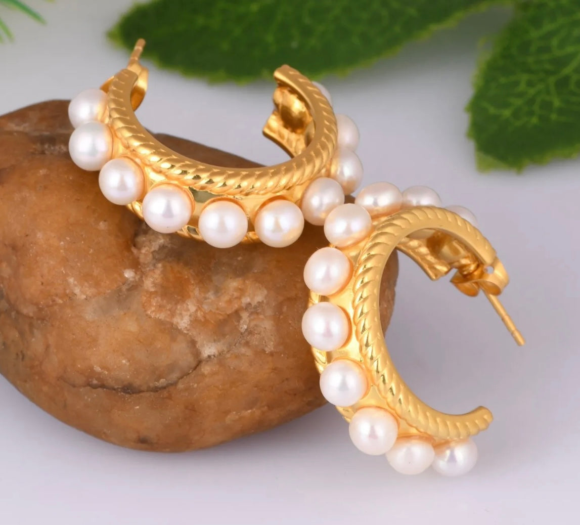 These stunning 1.07” (27.50mm) Freshwater Pearl hoops are a classic accessory featuring 24-karat Gold Vermeil and a unique twisted hoop design. Adorned with ten authentic 5mm freshwater pearls, these earrings make a timeless statement.