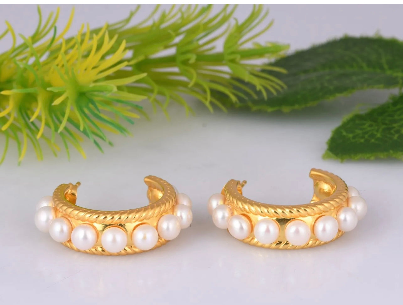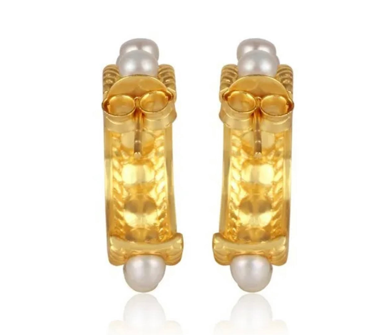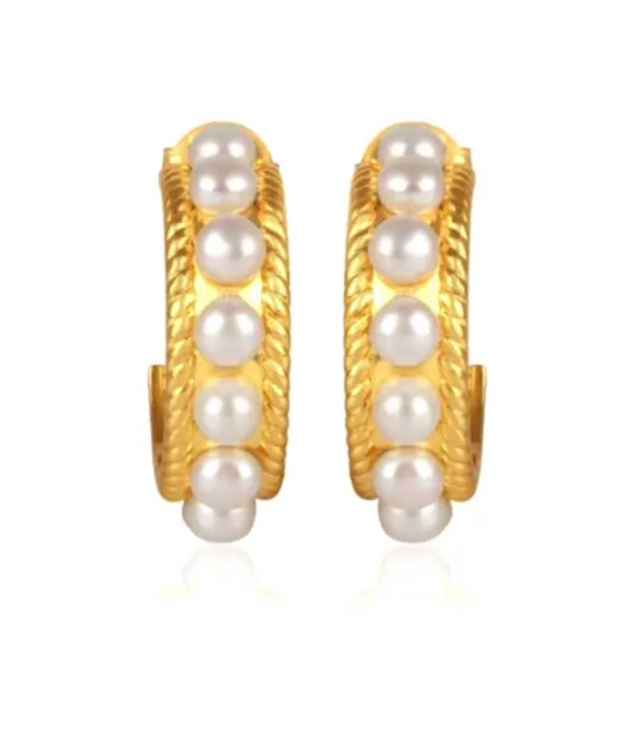 These stunning 1.07” (27.50mm) Freshwater Pearl hoops are a classic accessory featuring 24-karat Gold Vermeil and a unique twisted hoop design. Adorned with ten authentic 5mm freshwater pearls, these earrings make a timeless statement.