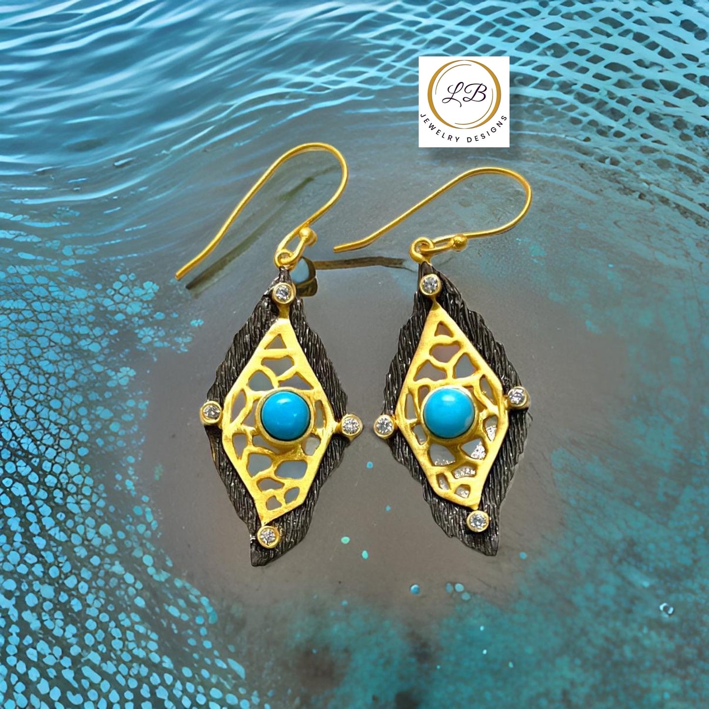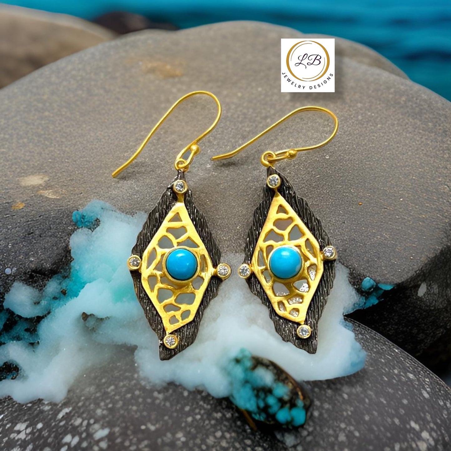 Luxurious and unique, these earrings feature an elongated diamond shape with textured black rhodium metal border, intricate filigree gold vermeil pattern, a stunning turquoise center gemstone, and sparkling CZ accents.