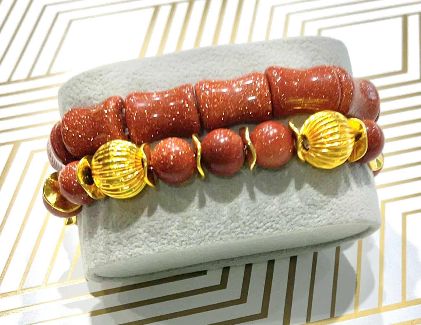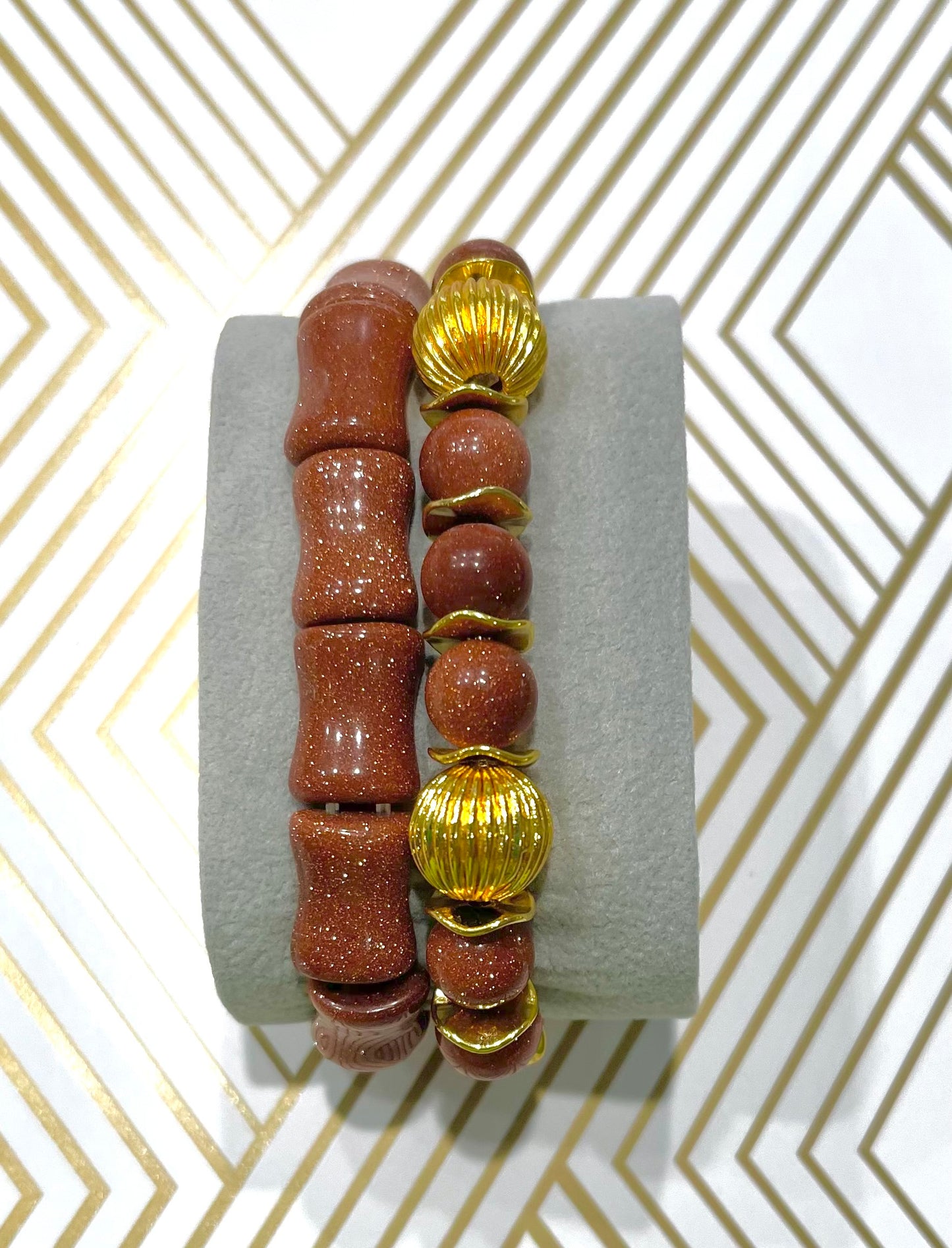This is a classic and sophisticated looking 7” bracelet set. Designed with shimmering and sparkling (12mm) brown sandstone gemstones and 18k gold-filled corrugated beads. This stone is sometimes known as "Monk's Gold." The bangle bracelet is handmade with glistening Gold Sandstone gemstone (goldstone) bamboo-style (16 mm) beaded bracelet and a perfect accessory year-round. Water resistant.