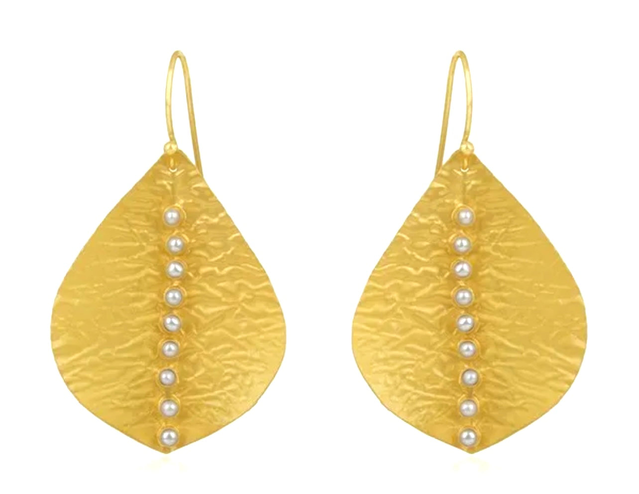 Enhance your collection with our Hammered 22k Gold Leaf Pearl Statement Earrings. Meticulously crafted with 24k gold vermeil, ten 2mm white pearls, these earrings offer both style and quality. The lightweight design and use of 91.7% pure 22-karat yellow gold leaf make these earrings a must-have for any fashion-savvy individual. Measuring 2.5" in drop length and 1.5" in width, they are both practical and chic.